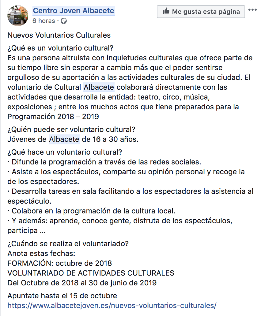 ¿Voluntarios Culturales o «trabajadores» gratis para Cultural Albacete?, esa es la pregunta que se están realizando muchos profesionales tras ver con asombro como el consorcio Cultural Albacete promociona esta opción que se realiza por segundo año. Según la información que publica el Centro Joven de Albacete un ‘Voluntario Cultural’ “Es una persona altruista con inquietudes culturales que ofrece parte de su tiempo libre sin esperar a cambio más que el poder sentirse orgulloso de su aportación a las actividades culturales de su ciudad”, es decir, una persona que no va a cobrar nada por realizar una tarea que «debería ser retribuida y realizada por profesionales». Es decir, según denuncian a El Digital de Albacete, los voluntarios culturales de Cultural Albacete no estarán dados de alta en el Régimen General de la Seguridad Social, no cotizarán y no generarán derechos al final de su actividad, pero eso sí, deberán realizar funciones como “desarrollar tareas en sala facilitando a los espectadores la asistencia al espectáculo”,algo que habitualmente realizan azafatas y azafatos legalmente contratados, “asiste a los espectáculos, comparte su opinión personal y recoge la de los espectadores”, algo que realizan encuestadores. Según el programa va dirigido a Jóvenes de Albacete de 16 a 30 años y no se realizaría ninguna modalidad contractual en formación o prácticas. Profesionales del sector señalan que si Cultural Albacete quiere aumentar sus servicios lo haga contratando gente y generando empleo, «no utilizando una fórmula de dudosa aplicación en este caso», y si lo que quieren es formar a profesionales, que lo hagan a través de los contratos «legalmente destinados a tal fin» y que anteriormente hemos citado.