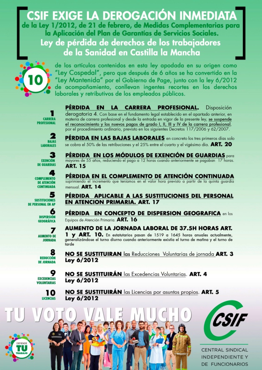 También manifiestan desde CSIF que «a la ‘ley Cospedal’ se suma la ley 6/2012 de acompañamiento del Plan de Garantía, las cuales mantienen bloqueada la carrera profesional en el Sescam produciendo un un trato de desigualdad retributiva entre empleados que prestan los mismos servicio. Asimismo, continúa la pérdida salarial en las bajas laborales, en los módulos de exención de guardias a mayores de 55 años y en el complemento de atención continuada; no se sustituyen a los trabajadores de todas las categorías sanitarias y no sanitarias desde el primer día, lo que provoca mermas importantes en los servicios que se ofrecen a la ciudadanía; tampoco se sustituyen a los trabajadores en las licencias por asuntos propios, en las excedencias voluntarias ni a aquellos que se acogen a reducción de jornada».