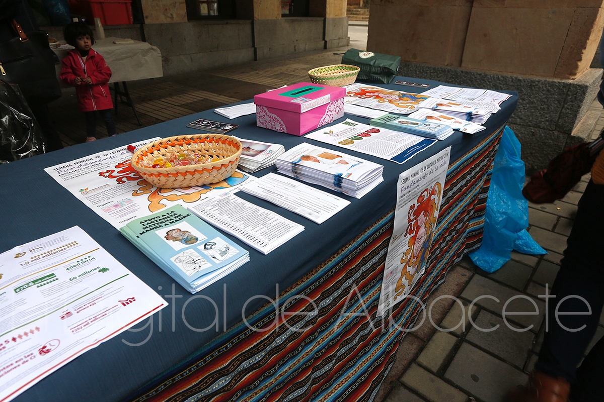 Estas actividades, que han tenido lugar en los soportales del Ayuntamiento de Albacete, han estado enfocadas a ofrecer información sobre la lactancia materna y sus beneficios, así como actividades paralelas para las familias con niños que se han acercado hasta este punto para ser asesorados.