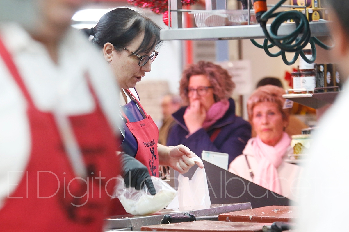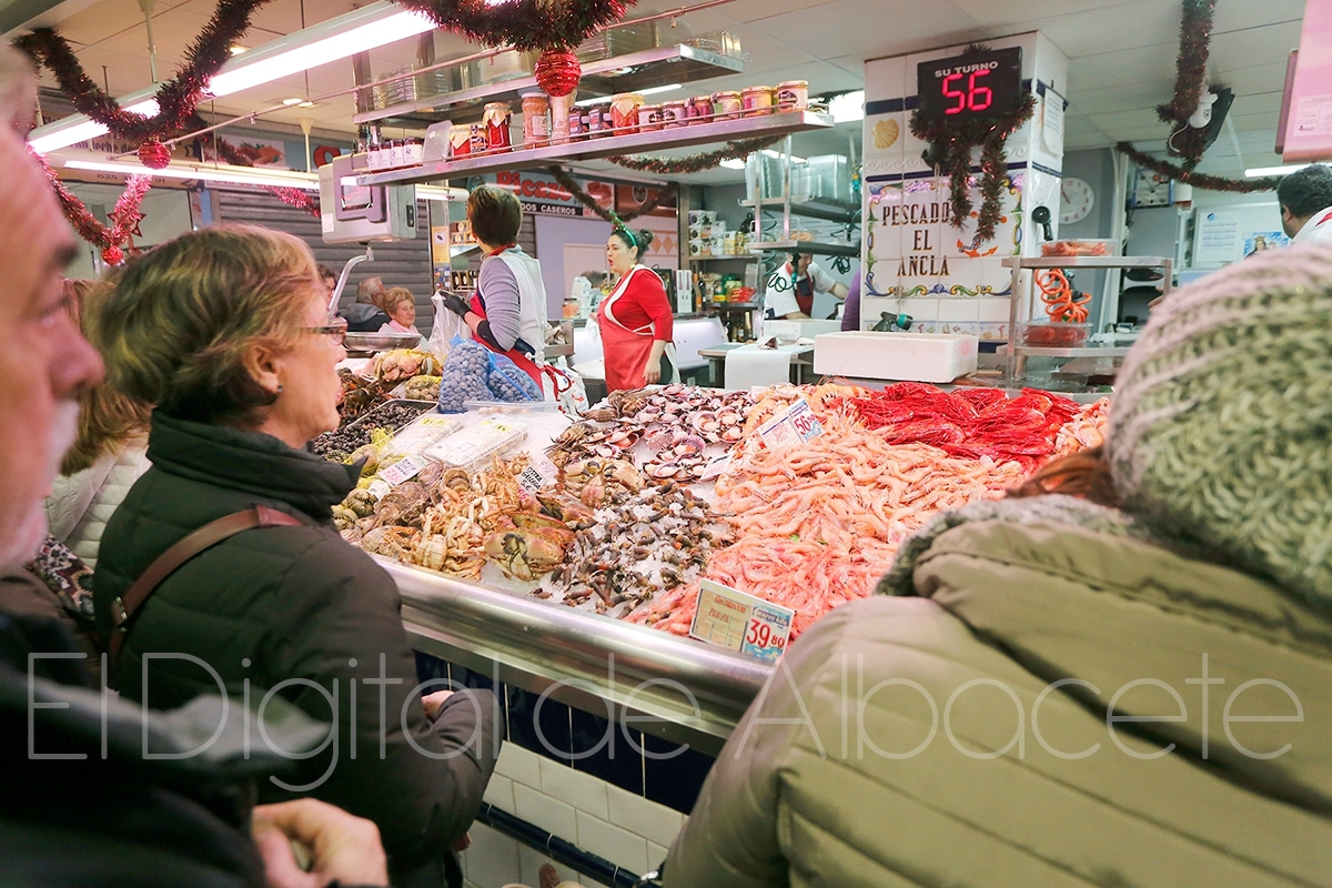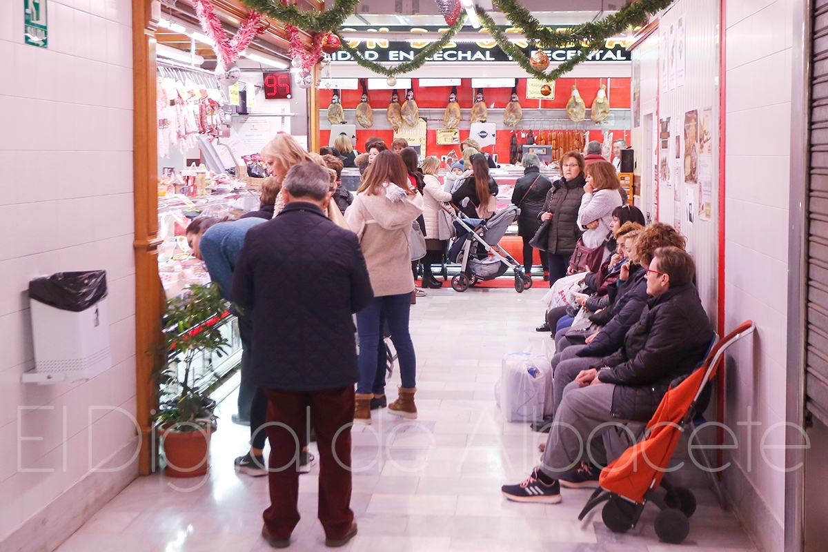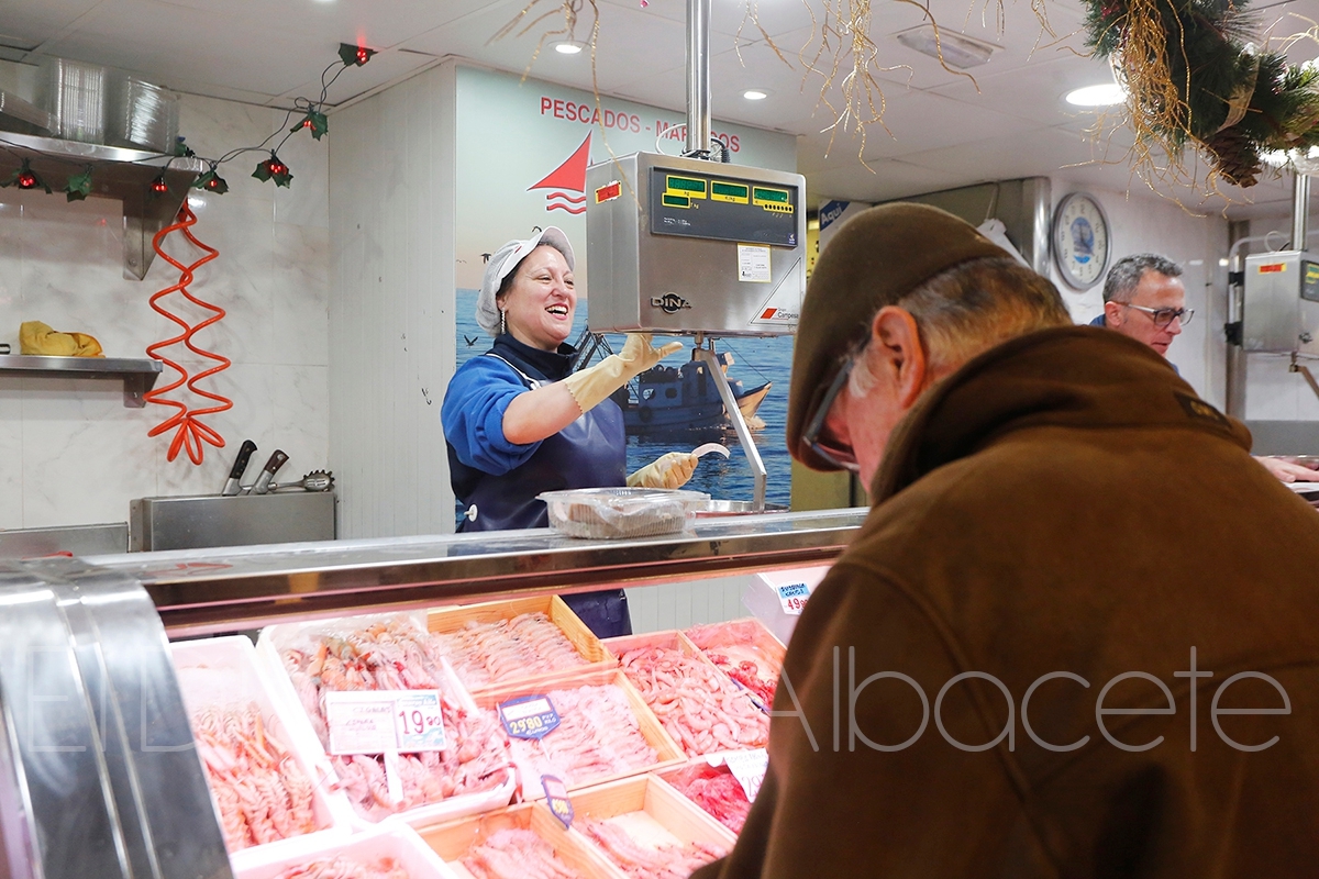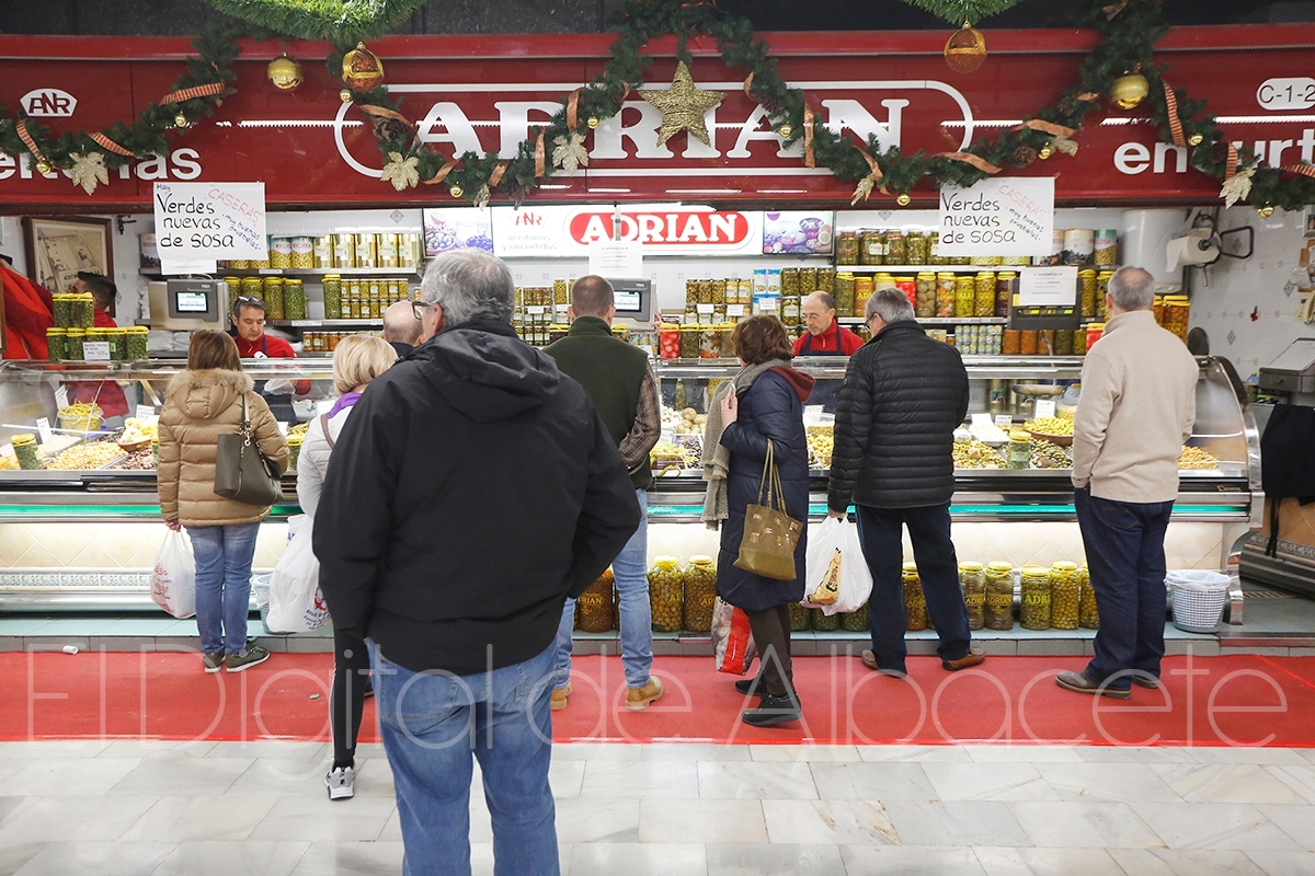 El Mercado de Villacerrada es un hervidero de gente este 24 de diciembre, y es que, hasta última hora los albaceteños aprovechan para comprar los productos que compondrán las mesas de esta noche, la más familiar del año. Cordero, cigalas, ibéricos, tablas de paté, queso, y de postre, melón, turrones y mantecados manchegos son los preferidos para la Nochebuena.