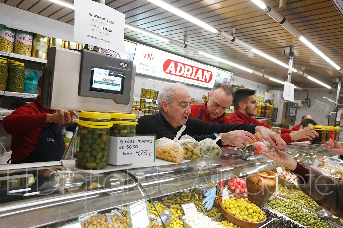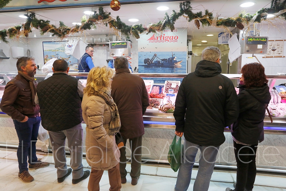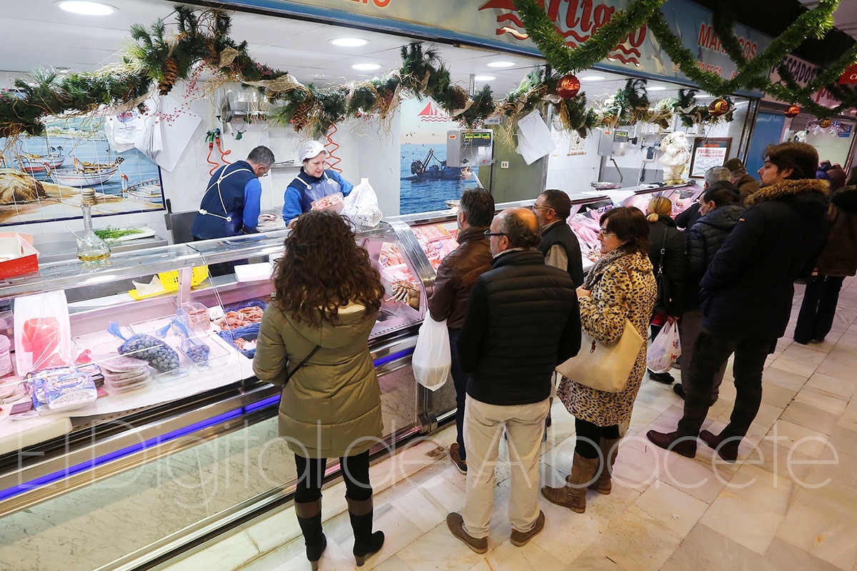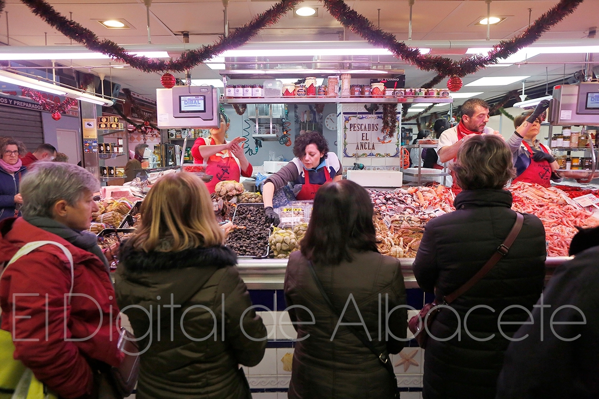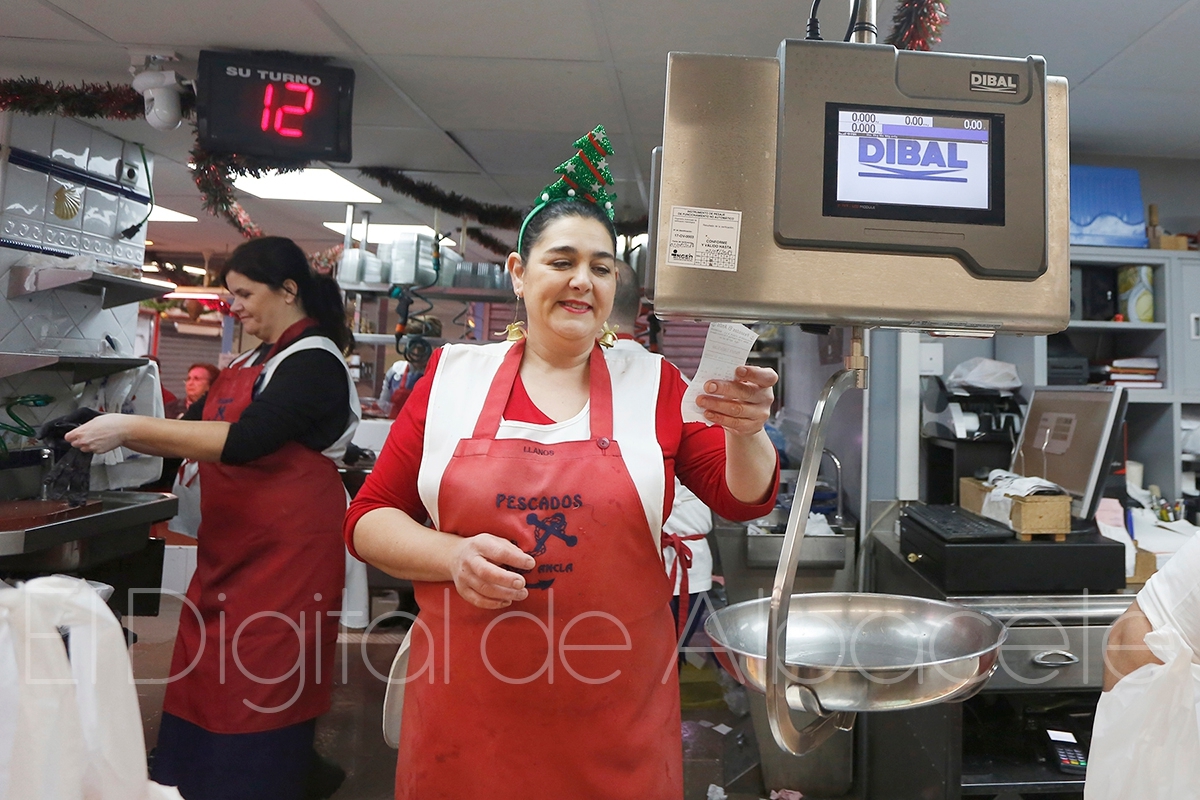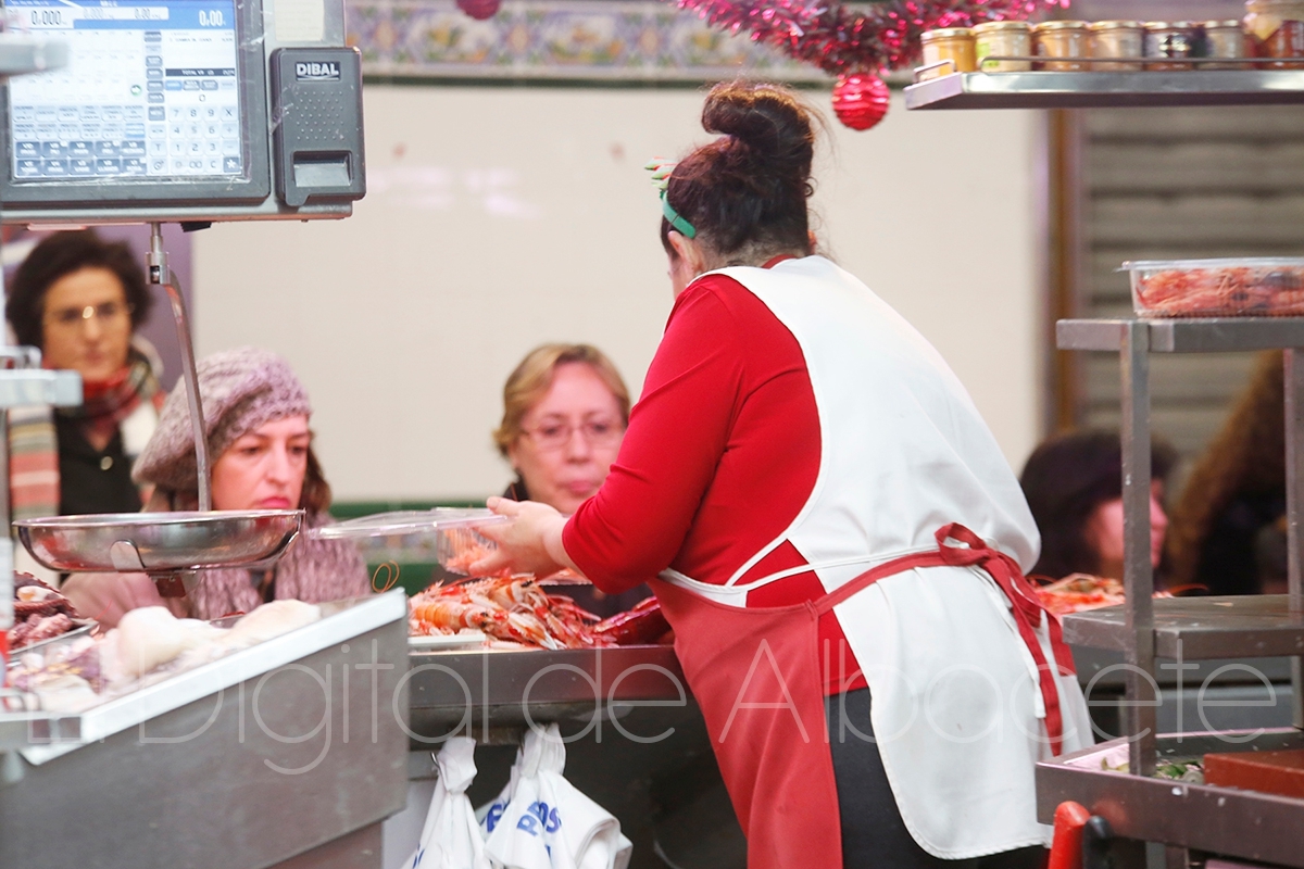 El Mercado de Villacerrada es un hervidero de gente este 24 de diciembre, y es que, hasta última hora los albaceteños aprovechan para comprar los productos que compondrán las mesas de esta noche, la más familiar del año. Cordero, cigalas, ibéricos, tablas de paté, queso, y de postre, melón, turrones y mantecados manchegos son los preferidos para la Nochebuena.
