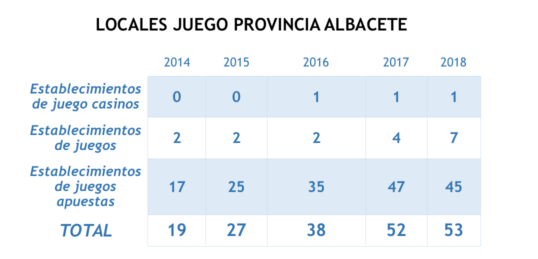 En el año 2014, en la provincia albaceteña había en vigor 19 licencias para esta actividad, correspondían 2 a establecimientos de juegos y 17 a establecimientos de juegos apuestas. El año siguiente, en 2015, eran ya 27 las licencias en vigor: 25 en establecimientos de juegos apuestas y las mismas de establecimientos de juegos. En 2016, a los 25 locales de apuestas hay que sumarles 10 más, los mismos dos de establecimientos de juegos y se otorga la licencia de un casino (un total de 38 locales de juego); en 2017 se mantiene la cifra de un casino, 4 establecimientos de juego y 47 locales de apuestas (un total de 52 locales de juego). El año pasado se cerró con 53 locales con licencia: 1 casino, 7 locales de juego (tres más que el año anterior) y 45 de apuestas, dos menos que en 2017.