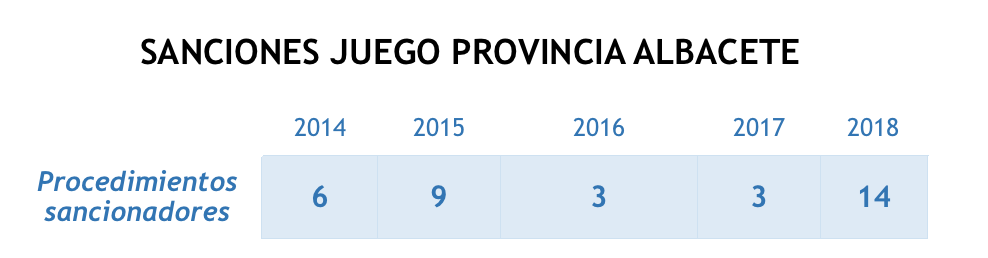 Así, estos nuevos empleados públicos, desde el pasado mes de octubre que comenzaron a trabajar, refuerzan la labor de inspección que desarrolla la Policía Nacional. Estos inspectores, entre otras decisiones, podrán poner infracciones recogidas en la Ley del Juego y las Apuestas de Castilla-La Mancha que prevé multas de hasta 3.000 euros para las infracciones leves, de 3.000 a 6.000 para infracciones calificadas como graves y de 6.000 a 600.000 euros para las infracciones muy graves. También esta ley contempla la suspensión temporal de la autorización concedida, el cierre del local o la inhabilitación del titular por un período máximo de un año, informaba la Junta. En tal caso, en 2014 se iniciaron 6 procedimientos sancionadores en la provincia de Albacete, 9 en 2015, 3 en 2016 y 2017, y 14 en 2018 (aunque estos últimos datos no son definitivos todavía).