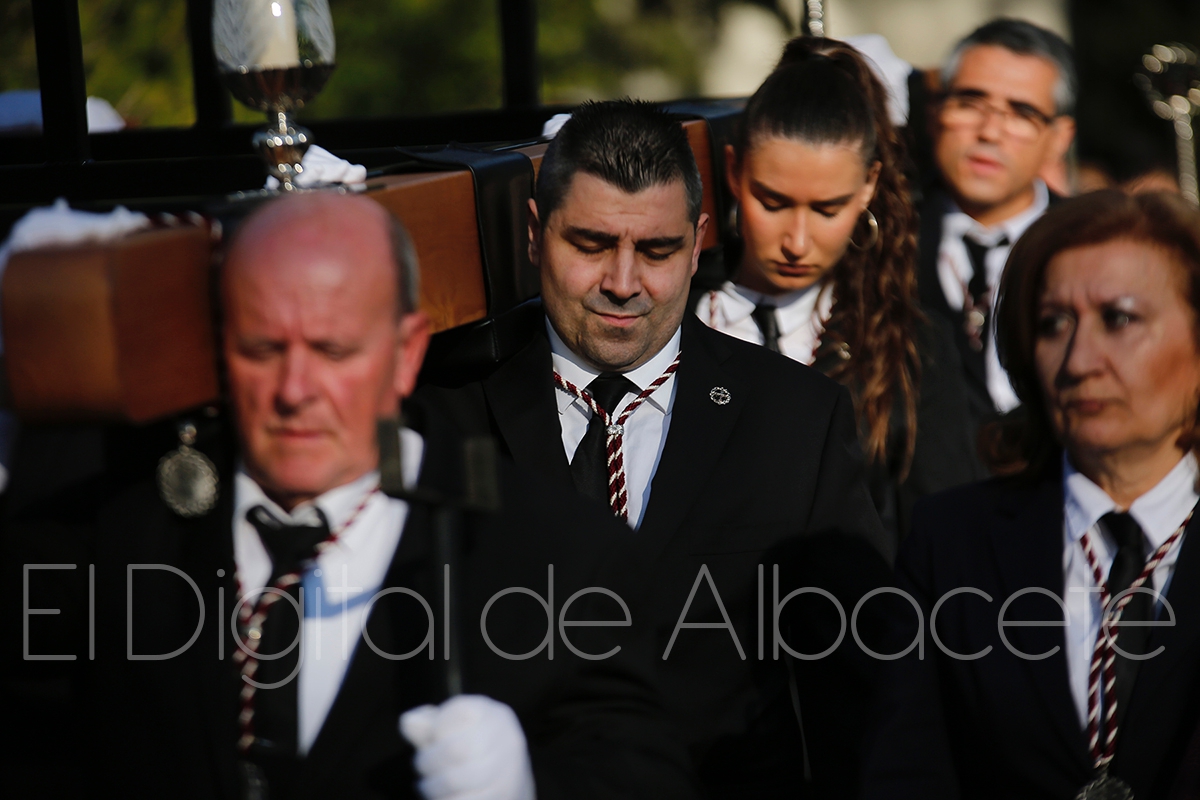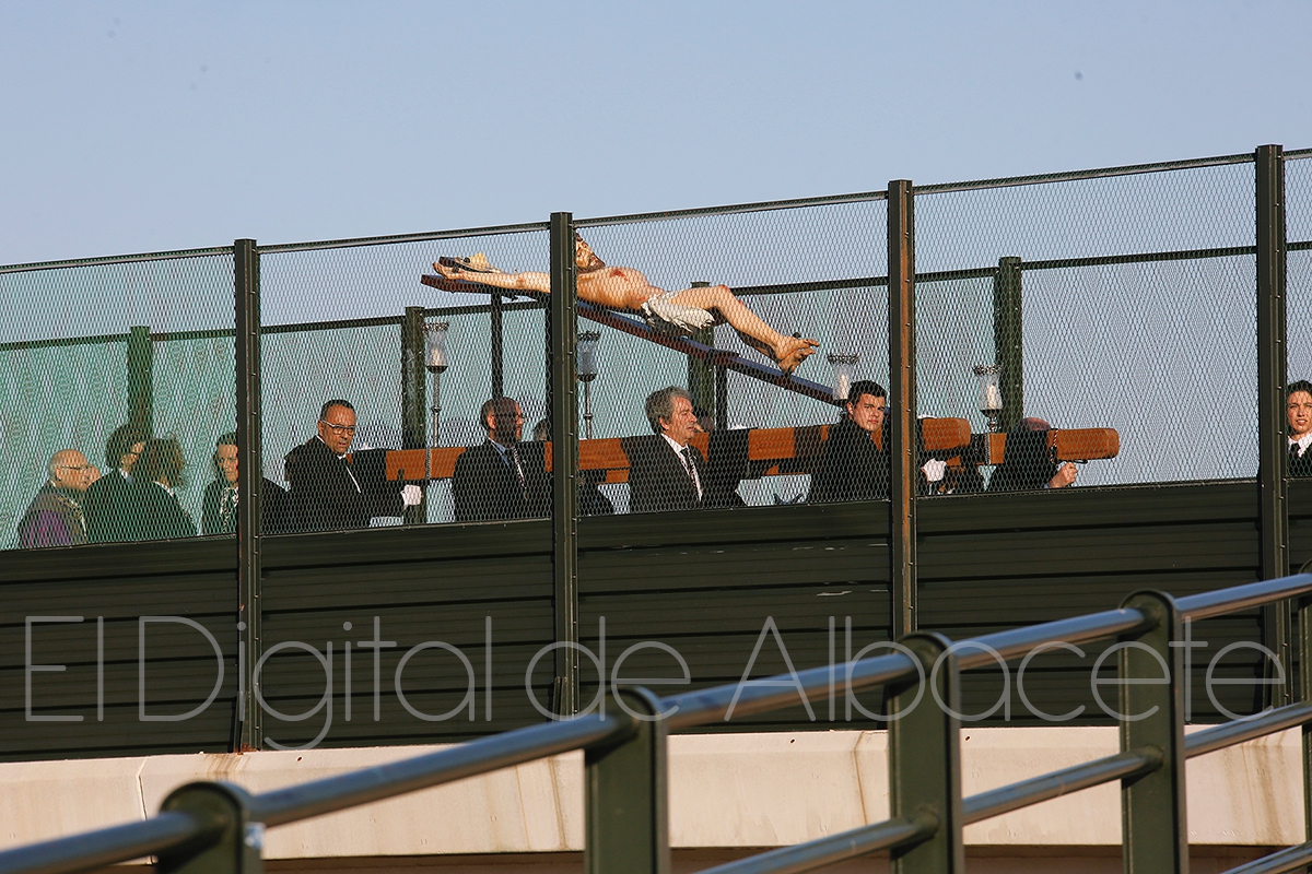 El atardecer dejaba imágenes espectaculares, acompañando durante su traslado a la parroquia del Buen Pastor al Santísimo Cristo de las Misericordias, conocido como Cristo del Cementerio. Una solemne y austera procesión que se ha convertido en toda una tradición en Albacete.