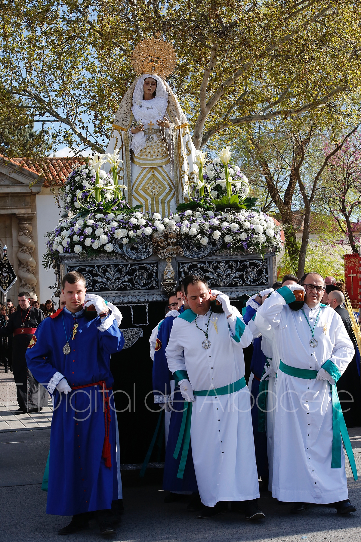 Tras el discípulo, procesionaba María Santísima de La Paz, una de las pocas imágenes de la Semana Santa de Albacete que es portada a costal bajo el trono pero que este domingo ante la falta de costaleros ha tenido que ser portada a hombros con miembros de varias cofradías. Esta imagen pertenece a la Cofradía de Santa María Magdalena, fundada en 1987 por un grupo de mujeres.