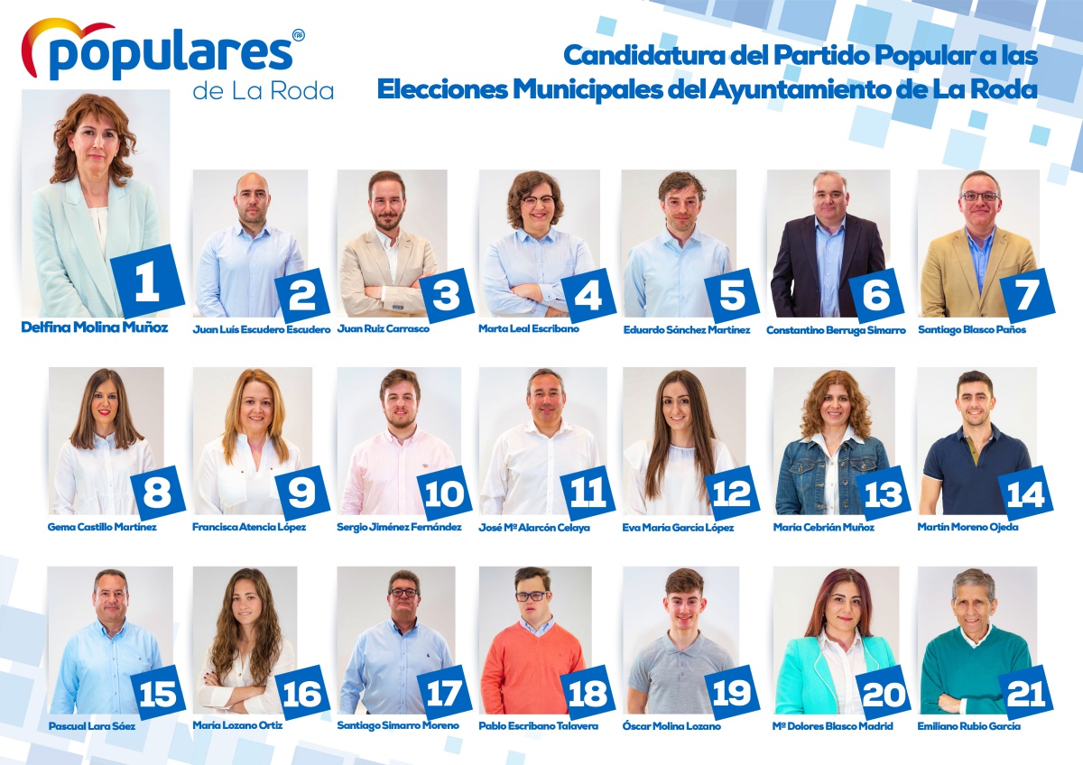 En el número 6 acompaña a Delfina Molina, Constantino Berruga, actual portavoz del equipo de gobierno y en el número 7, Santiago Blasco, economista y asesor fiscal. En el número 8, Gema Castillo, maestra de audición y lenguaje y maestra en educación especial y en el número 9, Paqui Atencia, actual concejal de urbanismo del Ayuntamiento de La Roda.