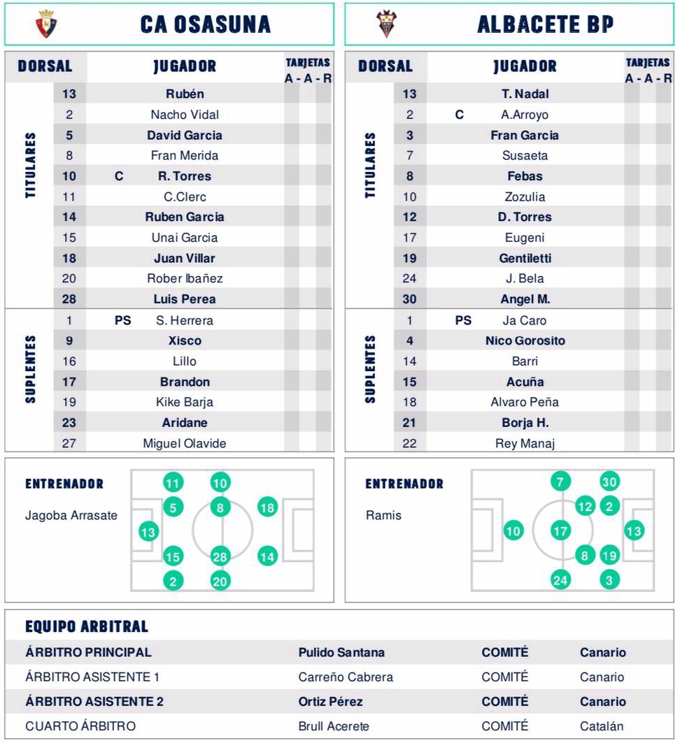 Así pues, Tomeu Nadal estuvo bajo palos; el citado Ángel Moreno en el lateral derecho, Fran García en el izquierdo y Álvaro Arroyo y Santiago Gentiletti en el centro de la zaga; Dani Torres y Febas estuvieron en el doble pivote, Susaeta en el ataque por banda diestra, Bela por la siniestra, Eugeni en la media punta y Zozulia como hombre más adelantado del Albacete Balompié este sábado en El Sadar.