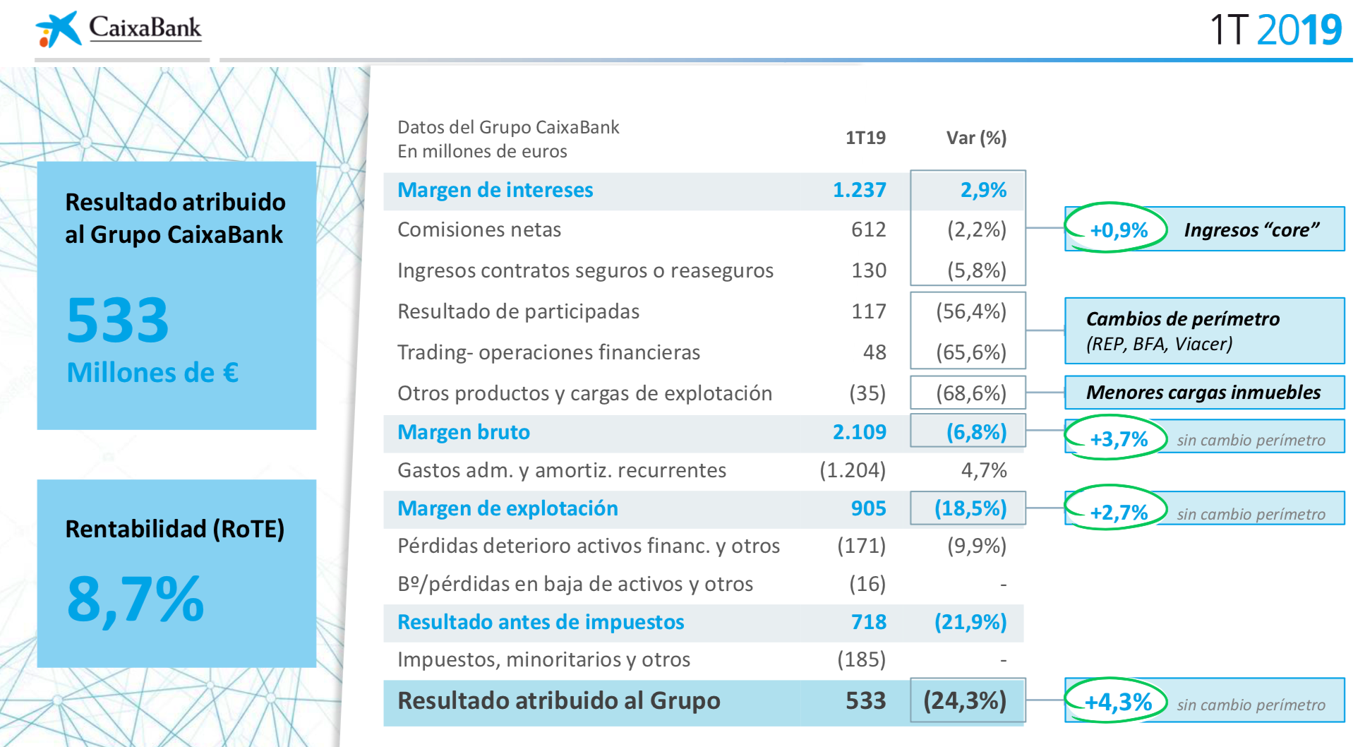 El resultado del Grupo se ve impactado por la no atribución de los resultados de Repsol y BFA (63 y 76 millones en 2018, respectivamente), así como por la revalorización en 2018 de la participación de BPI en Viacer (54 millones). Sin estos impactos extraordinarios, el resultado del trimestre crece un 4,3%.