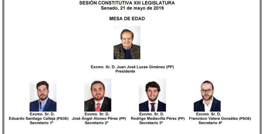 El responsable de la Mesa de Edad del Senado es Juan José Lucas, de 75 años de edad, y procedente del Partido Popular, que a su vez fue presidente del Senado, de la Junta de Castilla y León y exministro de José María Aznar. Además de Fran Valera, a Lucas le acompañan el secretario I, Eduardo Santiago, el más joven de ellos, con 24 años y del PSOE; el secretario II es el miembro del Partido Popular, José Ángel Alonso y el secretario III es el también ‘popular’, Rodrigo Medianilla.