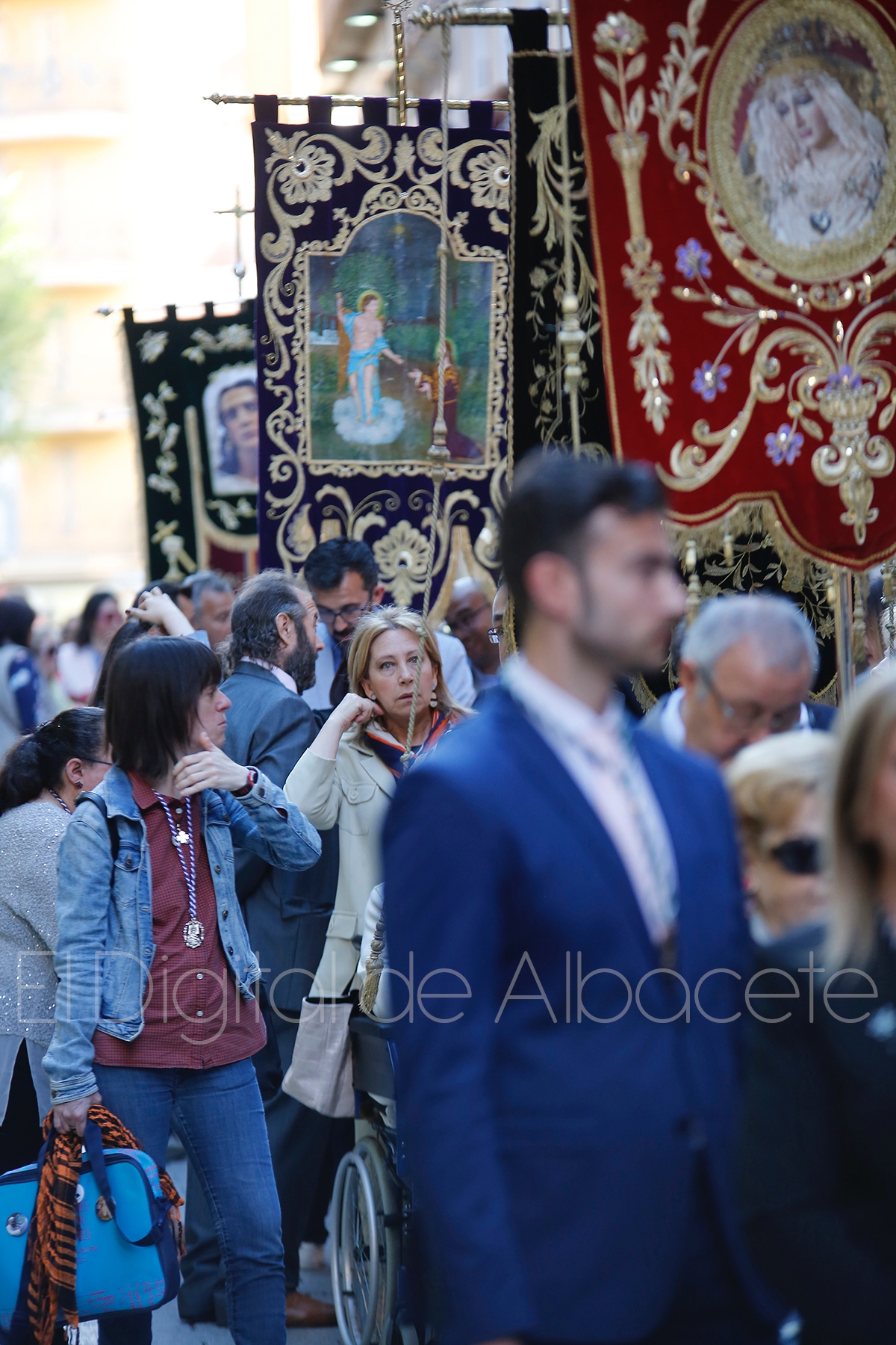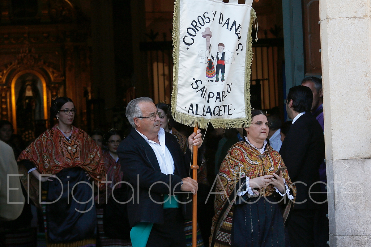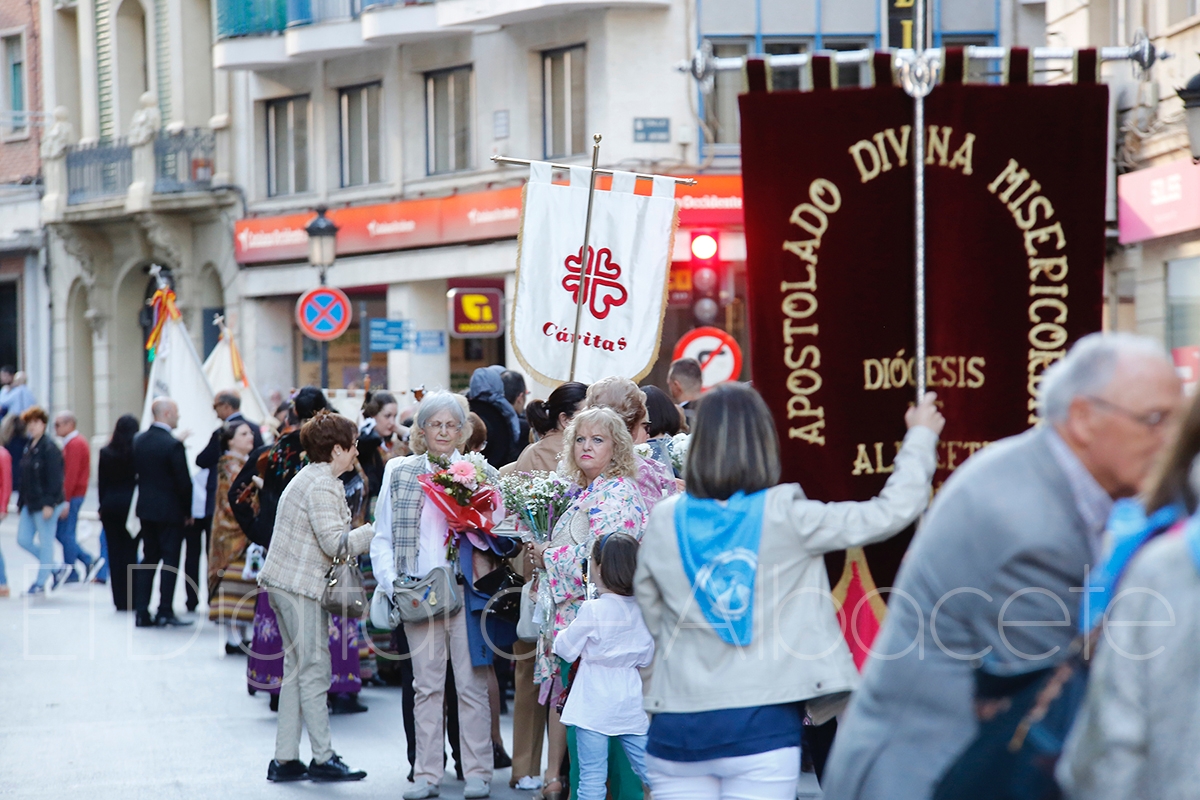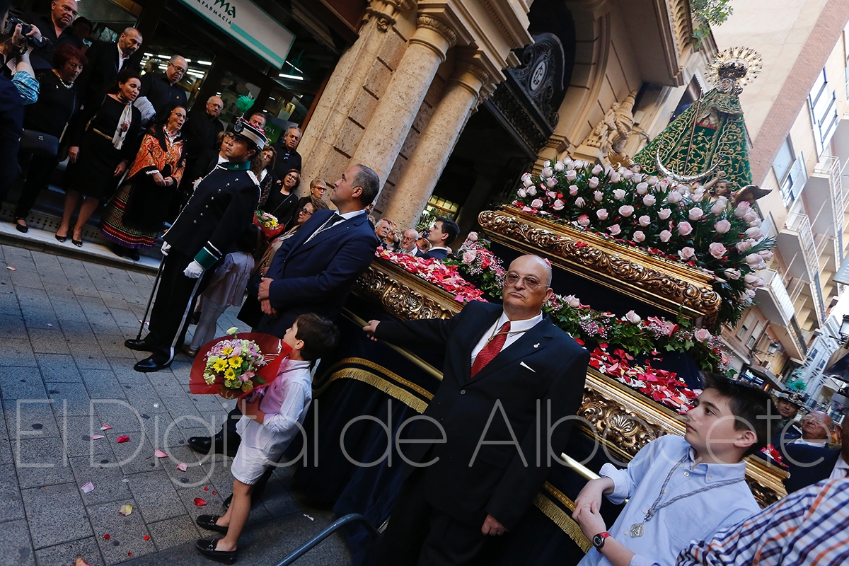 Como gesto de devoción y respeto, muchos de los asistentes han acompañado a la Virgen de los Llanos vistiendo el traje regional, dando colorido a esta procesión. Junto a ellos la Banda de Cornetas y Tambores ‘Virgen de Los Llanos’ y el resto de grupos de folklore -Raíces del Llano, El trillo, Abuela Santa Ana, San Pablo y Magisterio-, asociaciones, estandartes religiosos, manolas y devotos, desde la Catedral, Bajada de San Juan, donde por primera vez se ha instalado una gran alfombra de serrín típica de Elche de la Sierra, San Julián, Cura, Méndez Núñez, Plaza Mayor, calle Mayor, donde por quinto año consecutivo ha tenido lugar una petalada de más de 200 claveles, Marqués de Molins, Altozano, Martínez Villena, Bajada de San Juan a Plaza Virgen de los Llanos.
