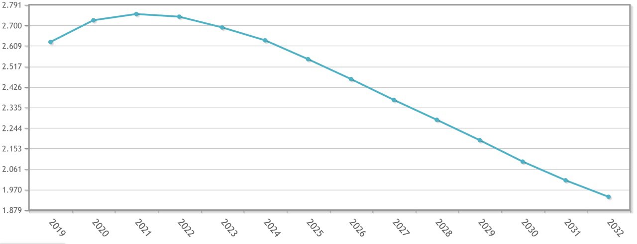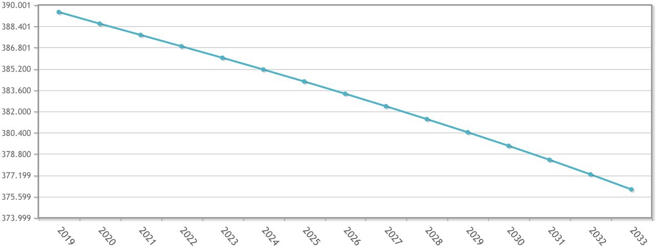 Cifras que, de cumplirse las previsiones del Instituto Nacional de Estadística, INE, se traducirían en una población de 376.138 habitantes en 2033. En estos años bajará el número de personas de origen extranjero que decidan vivir en nuestra provincia, pasando como muestra el gráfico siguiente, de las 2.625 personas inmigrantes de 2019 a las 1.938 del año 2032; es decir, casi 700 personas menos. Hasta 2022 estas cifras serán estables e incluso irán creciendo, pero será a partir de 2023 cuando empiecen a caer.