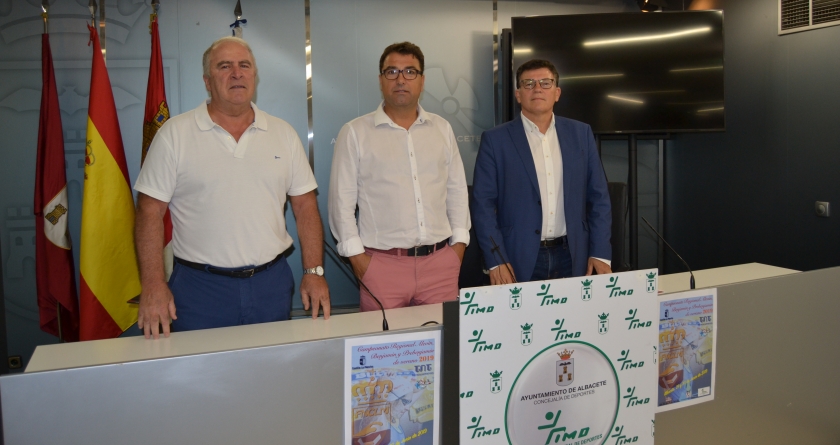 El concejal de Deportes del Ayuntamiento de Albacete, Modesto Belinchón, presentó esta mañana, junto al delegado provincial de Educación, Cultura y Deportes, Diego Pérez; y el delegado provincial de la Federación de Natación de Castilla-La Mancha, Luis Manuel Ulacia, el Campeonato Regional de Natación, en las categorías alevín, benjamín y prebenjamín, que se celebrará el próximo sábado, 29 de junio, y domingo, 30 de junio, en la Piscina Municipal.