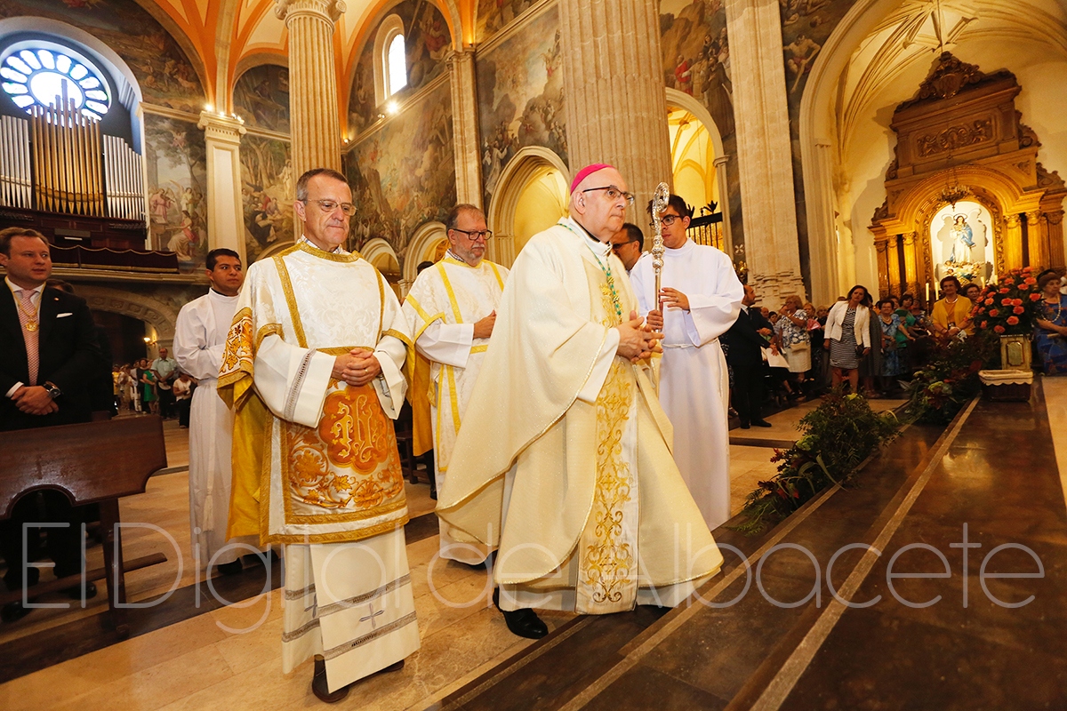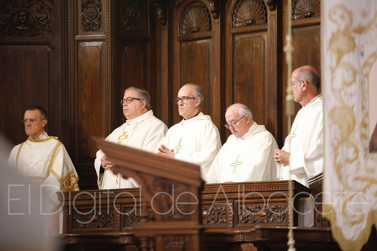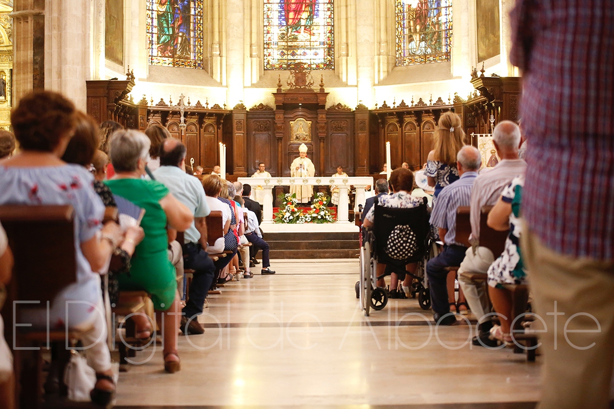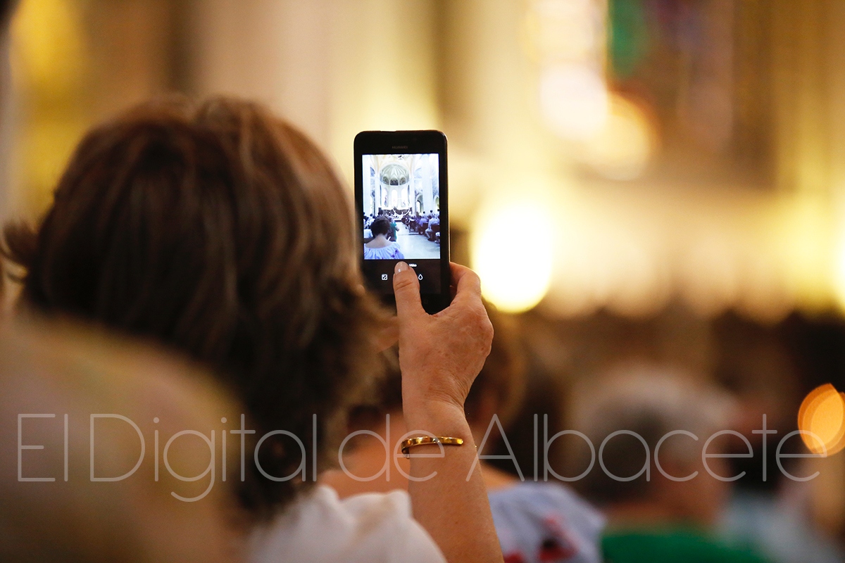 El repique de campanas de la Catedral de Albacete ha llamado, como es de costumbre cada 8 de septiembre, a los albaceteños que han acudido a la Misa Pontifical con motivo de la festividad de la Virgen de Los Llanos. Una celebración litúrgica que ha aglutinado a cientos de feligreses llenando el Templo, como en contadas ocasiones puede verse, en una homilía oficiada por el Rvrdmo. Obispo Sr. D. Ángel Fernández de la Diócesis de Albacete, en la que sentados, de pie o casi a las puertas de la Catedral nadie ha querido perderse un acto que, además, ha estado acompañado por el celestial Coro Universitario de Albacete.