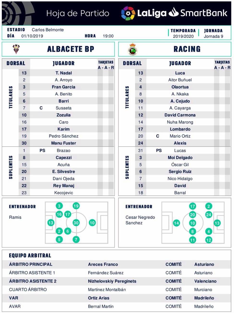Para medirse al Rácing el entrenador del Alba presentó novedades en el once y Susaeta ocupó el puesto de un Álvaro Jiménez que se fue a la grada por decisión técnica, Karim ocupó el del lesionado Olabe, y Manu Fuster y Barri hicieron lo propio con los de Rei Manaj y Eddy Silvestre, que comenzaron el partido en el banquillo.