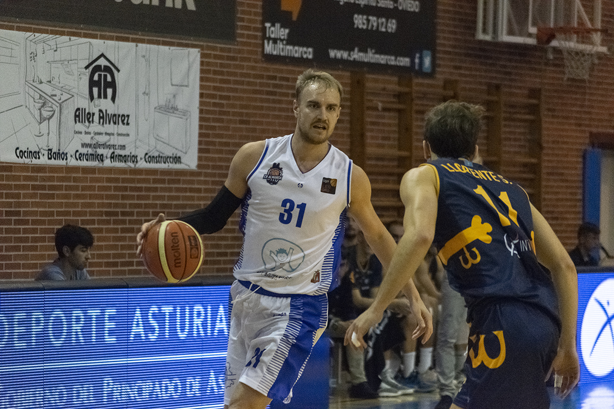Fueron 40 minutos de total igualdad y constantes alternativas en el marcador. Ya desde el principio del choque, se imponía un intercambio de canastas continuo. En el primer cuarto los almanseños no conseguían encontrar el camino al aro, pero sí que explotaron las faltas de los ovetenses, que rápidamente entraron en bonus. Los tiros libres y el rebote ofensivo fueron claves para que durante los dos primeros cuartos el equipo manchego mantuviese una ventaja corta, pero muy importante anímicamente durante los primeros 20 minutos del encuentro (21-22 y 35-38). La nota destacada de esta primera parte fue el pívot trinitense Kyle Rowley, autor de 8 puntos, 8 rebotes, 1 asistencia y 2 robos de balón en los primeros 20 minutos de juego. Sin duda, una de las mejores noticias para el cuadro dirigido por Rubén Perelló. Por parte de los locales, Sergio Llorente (11 puntos y 13 asistencias al final del encuentro), Alex Reyes y Devin Wright fueron los más destacados, siendo una constante amenaza en el esquema de Javi Rodríguez.