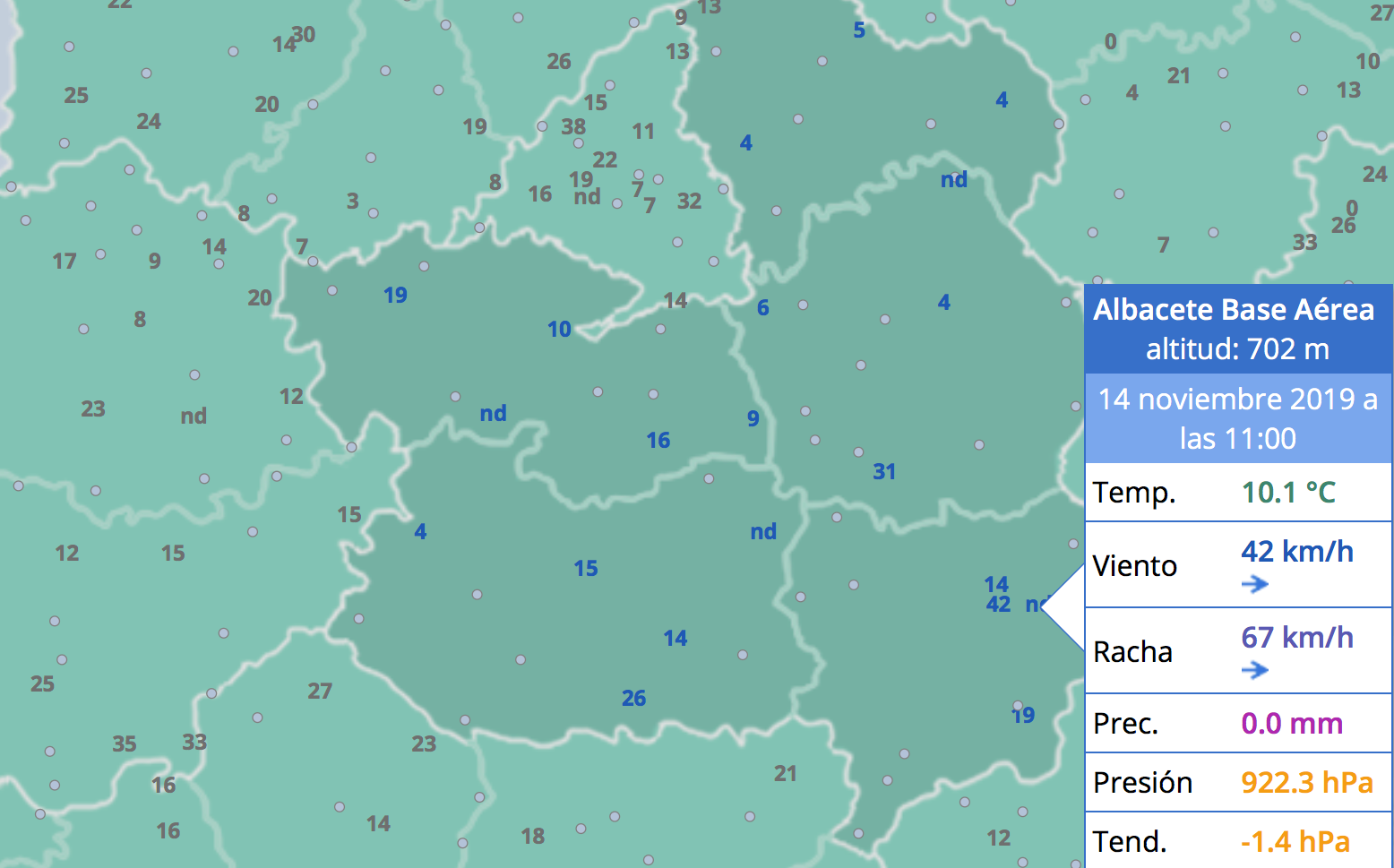 Según datos de la AEMET, a las 11:00 horas de este jueves, la velocidad del viento en Albacete capital a esas horas era de 42 kilómetros por hora y estaba acompañado de rachas que habían alcanzado valores cercanos a los 70 km/h.