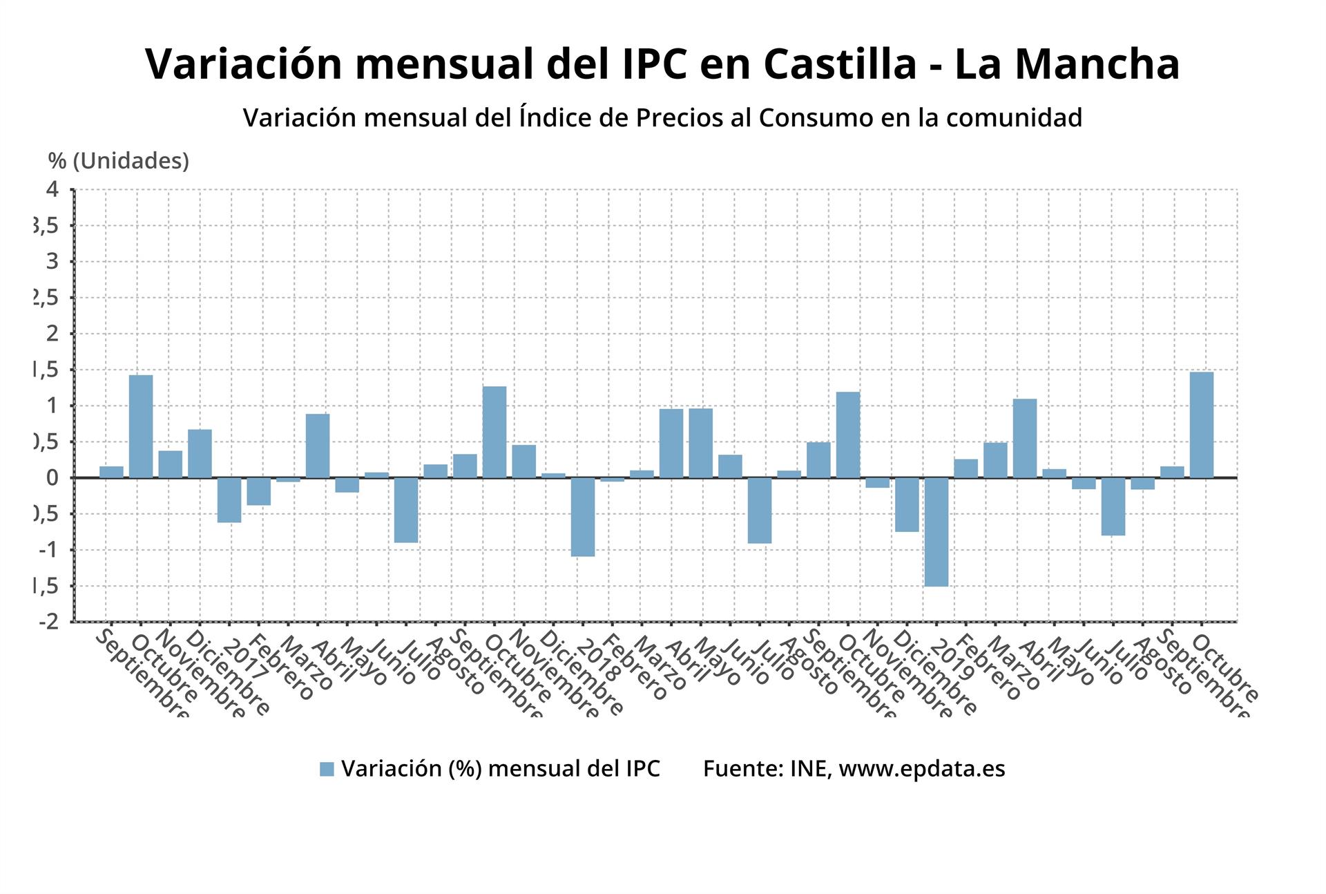 El Índice de Precios al Consumo (IPC) subió un 1,5% en octubre en Castilla-La Mancha en relación al mes anterior, mientras que la tasa interanual se mantiene, según ha informado este jueves el Instituto Nacional de Estadística (INE).