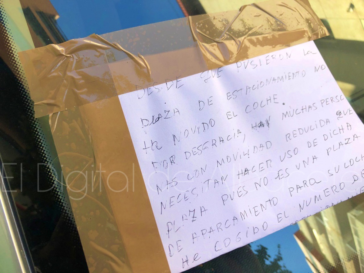 En dicha nota se puede leer lo siguiente: “Desde que pusieron la plaza de estacionamiento (para personas con movilidad reducida) no ha movido el coche. Por desgracia, hay muchas personas con movilidad reducida que necesitan hacer uso de dicha plaza, pues no es una plaza de aparcamiento (sólo) para su coche”.
