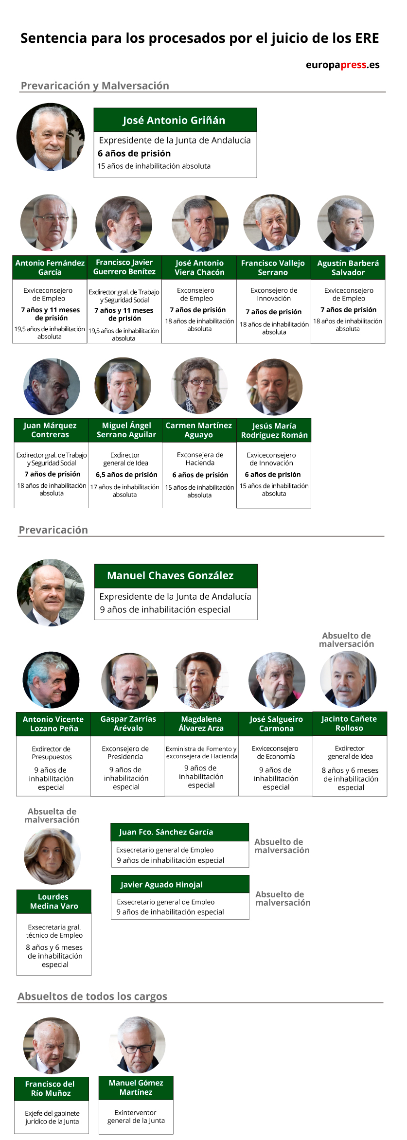Sólo dos de los 21 acusados han sido absueltos totalmente por la Audiencia Provincial de Sevilla; en concreto, el exinterventor general de la Junta Manuel Gómez –para quien la Fiscalía pedía seis años de prisión y 30 de inhabilitación por prevaricación y malversación continuadas– y el exjefe del Gabinete Jurídico Francisco del Río, que se enfrentaba a una pena solicitada por el Ministerio Público de diez años de inhabilitación para empleo o cargo público por un supuesto delito continuado de prevaricación.