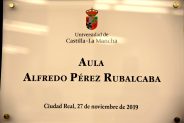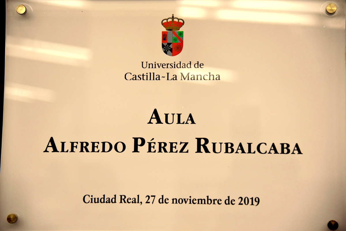 Al término del homenaje se ha descubierto una placa que recordará al exprofesor y exministro Alfredo Pérez Rubalcaba en el Aula Magna del Campus de la UCLM en Ciudad Real.