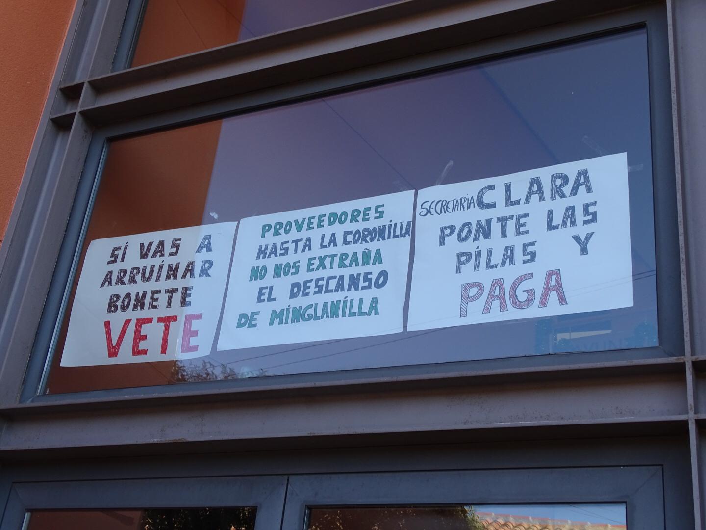 Una representación de proveedores se han manifestado esta mañana de lunes, 23 de diciembre, ante las puertas del Ayuntamiento de Bonete reclamando el abono de unas facturas que se les adeuda, algunos desde el pasado mes de julio, con pancartas en las que se podía leer: “Si vas a arruinar Bonete, vete”, “Proveedores hasta la coronilla, no nos extraña el descanso de Minglanilla”, “Secretaria Clara ponte las pilas y paga”.
