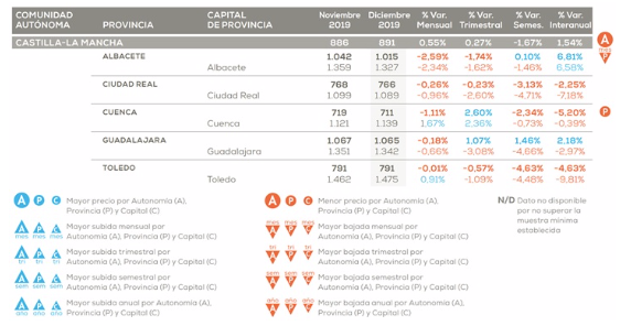Mensualmente, todas las provincias de la región cayeron, marcando Albacete (-2,59%) la caída más intensa del país. De un año a otro, Albacete (6,81%) arrojó la tercera subida más alta de España, mientras que Cuenca (-5,20%) fue la cuarta que más se ajustó de España. Con 1.065 euros por metro cuadrado en diciembre de 2019, Guadalajara fue la provincia más cara de la región. Cuenca (711 €/m²), Ciudad Real (766 €/m²) y Toledo (791 €/m²) fueron las provincias españolas más asequibles.