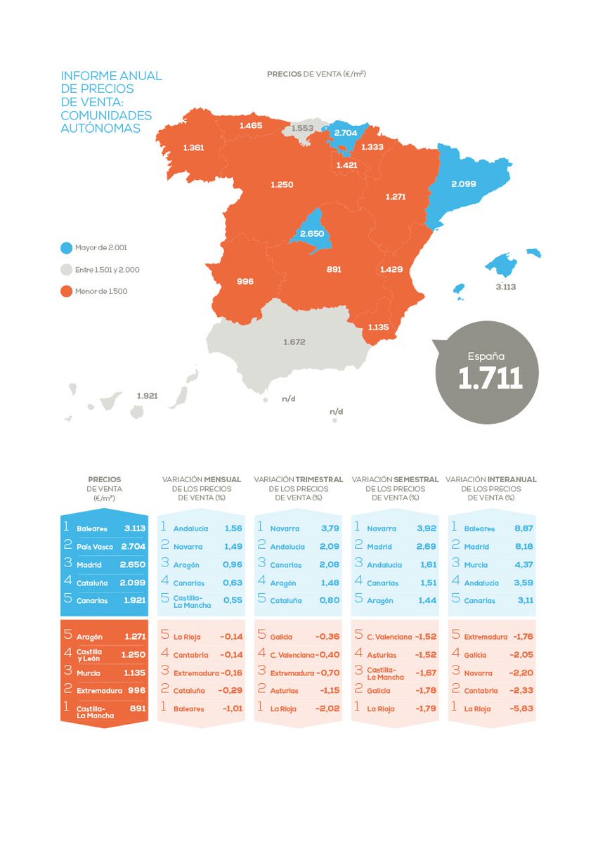 Castilla-La Mancha fue la autonomía más barata, seguida en segundo lugar por Extremadura (996 €/m²). En cuanto a la vivienda de segunda mano en España, en diciembre el precio medio fue de 1.711 euros por metro cuadrado. Esta cifra supuso una subida interanual del 2,33%. Respecto al último trimestre, el ascenso fue del 0,87%. Semestralmente, el recorte llegó hasta el -0,29%. El incremento mensual fue del 0,31%.