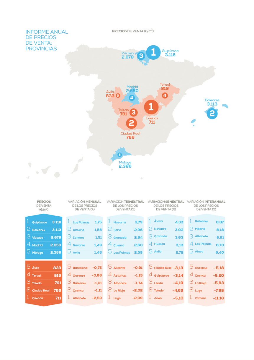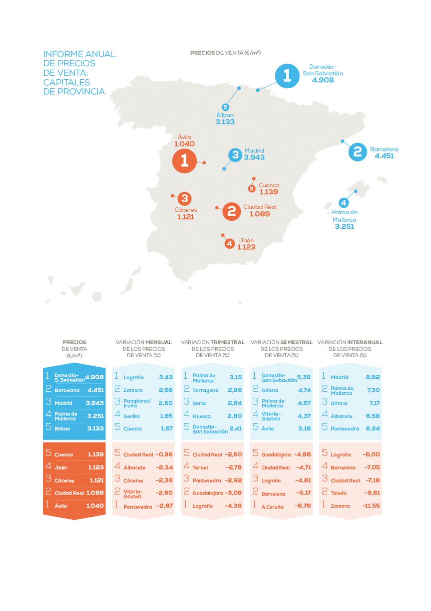 En cuanto a las capitales manchegas, Cuenca (1,67%) arrojó el quinto repunte mensual más señalado del cómputo nacional, mientras que Albacete (-2,34%) fue la cuarta capital que más cayó del país. De un año a otro, Albacete (6,58%) fue la cuarta provincia española que más repuntó, y Toledo (-9,81%) fue la segunda capital española que más bajó. En cuestión de precios, Toledo (1.475 €/m²) fue la capital más cara de Castilla-La Mancha y Ciudad Real (1.089 €/m²) la más barata, siendo la segunda más asequible de España.
