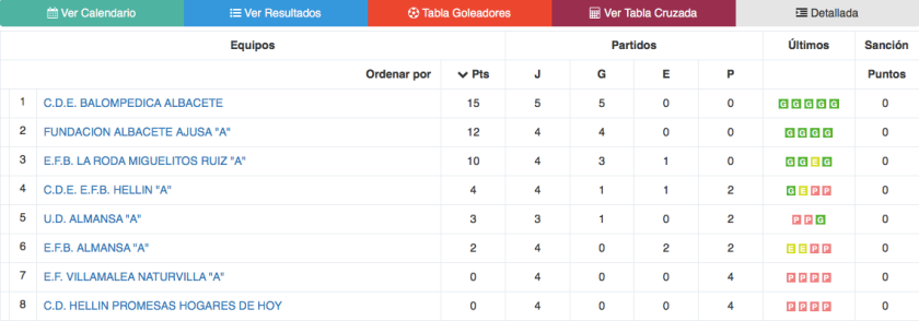 De este modo, tras haber disputado los encuentros correspondientes a esta nueva jornada de la Liga Globalcaja Benjamín, lidera la clasificación el CDE Balompédica Albacete, con un total de 15 puntos. Por el contrario cierra la tabla el CD Hellín Promesas Hogares de Hoy.