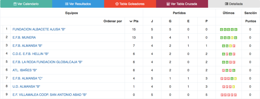 Así, tras poner en juego los choques correspondientes a la quinta jornada de la Liga Globalcaja Benjamín en la provincia de Albacete, encabeza la clasificación del Grupo B el Fundación Ajusa Albacete B con 15 puntos; mientras que en la parte baja de la tabla se encuentra la EF Villamalea Coop. San Antonio Abad B.