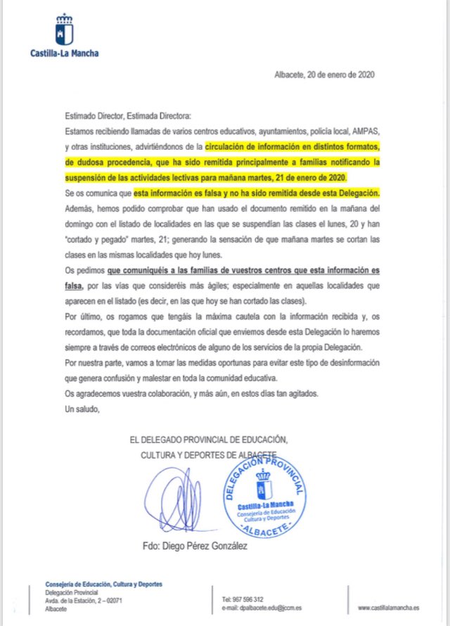 El Delegado de Educación en la provincia de Albacete, Diego Pérez, ha remitido un comunicado a los centros docentes de la provincia tras la aparición por redes sociales de un documento en el que supuestamente se informaba de la suspensión de clases para este martes en varios colegios de la provincia de Albacete, algo que ha catalogado de falso.