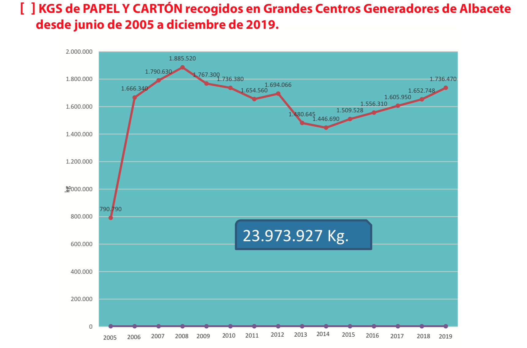 Así, Albacete Recicla, que se encarga del servicio de recogida selectiva de papel y cartón en comercios, oficinas y centros públicos de la ciudad de Albacete, así como de envases en centros educativos inició su andadura en el año 2005, desde 2011 incorporó la recogida en los Polígonos Industriales Campollano y Romica, ha recogido 23.973.927 kilos de papel y cartón desde 2005 a diciembre de 2019; además desde 2012, año que comenzó la recogida de envases ligeros, hasta diciembre de 2019 se han recogido 176.310 kilos de envases de este tipo.