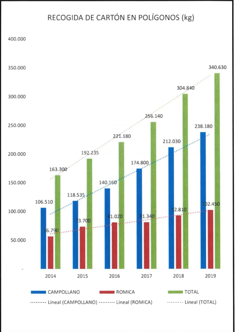 El servicio que se lleva a cabo en ambos polígonos industriales se afianza año tras año. De los datos se desprende un incremento constante en la recogida de kilos de cartón en ambos polígonos en los últimos cinco años, así en Campollano la recogida de cartón llegaba hasta los 106.510 kilos en 2014 cuando en el último año se recogieron 238.180 kilos, lo que supone también más del doble de la cantidad recogida en 2019 que en 2014. En el mismo cómputo pero en el polígono Romica el incremento es del 80%, hasta llegar en 2019 a los 102.450 kilos de cartón recogidos.