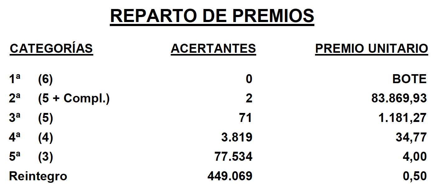 De Segunda Categoría (5 aciertos + Complementario) existen DOS boletos acertantes que han sido validados en el Despacho Receptor nº 72.155 de LOS CORRALES (Sevilla), situado en Alcalde Antonio Rueda, 18-A y en la Administración de Loterías nº 11 de TALAVERA DE LA REINA (Toledo), situada en Avda. Juan Carlos I, 19. Cada uno ellos recibirá 83.869,93 euros.