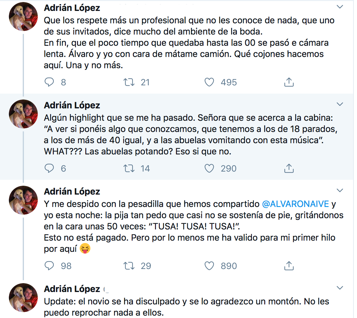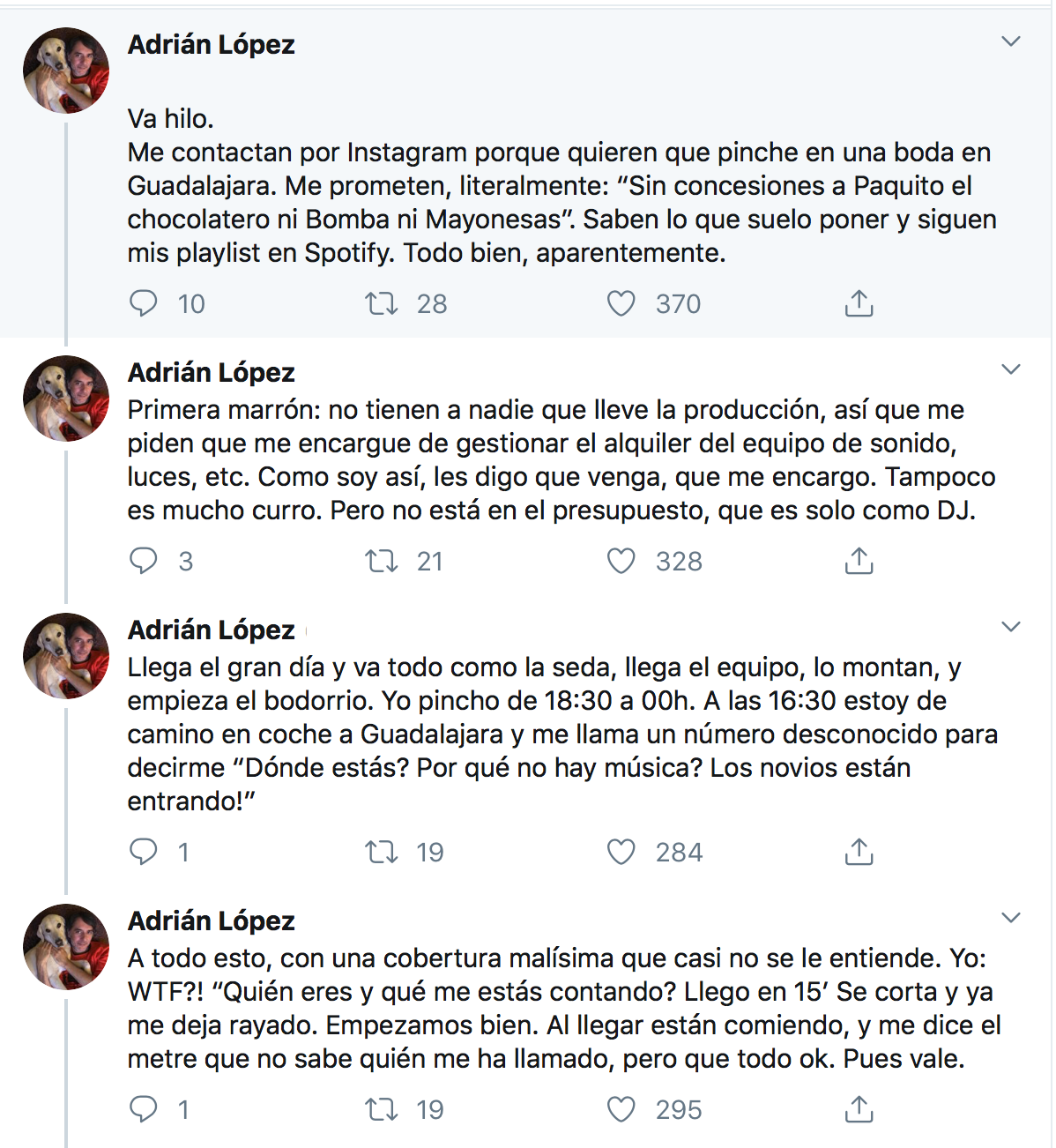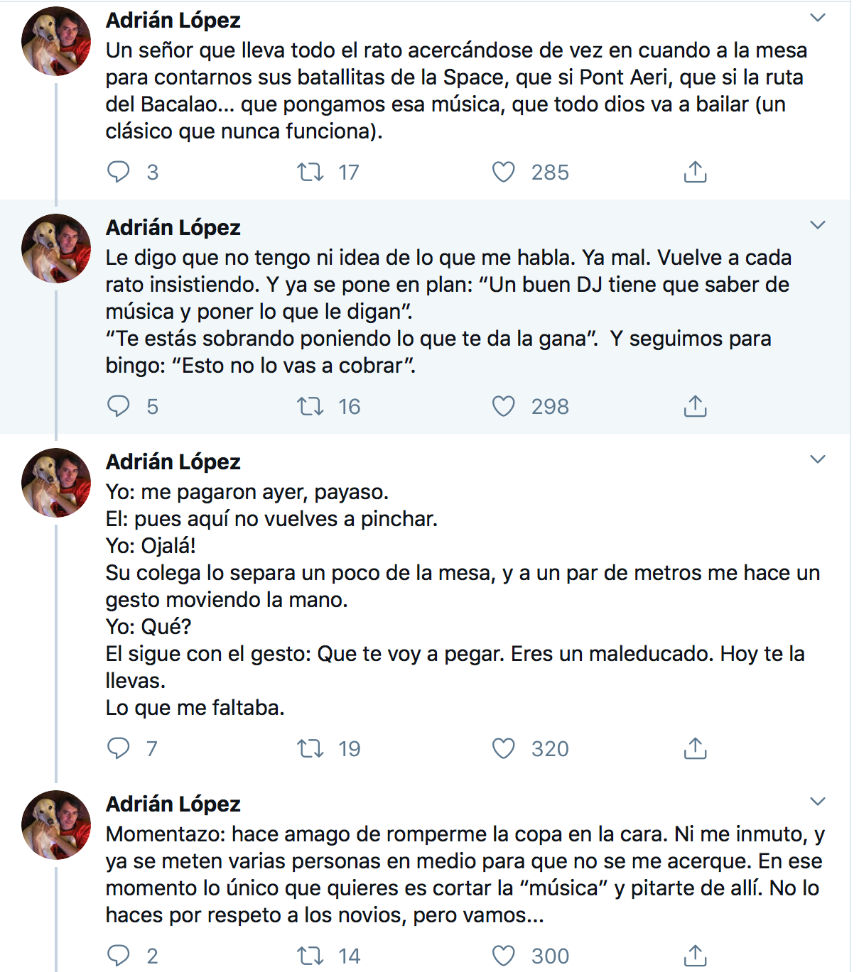 “Con casi 20 años como profesional, ayer pasé mi peor experiencia como DJ, trabajando en una boda. Jamás me había encontrado con una panda de energúmenos tal”, comienza el hilo de Adrián López y que a continuación les reproducimos: