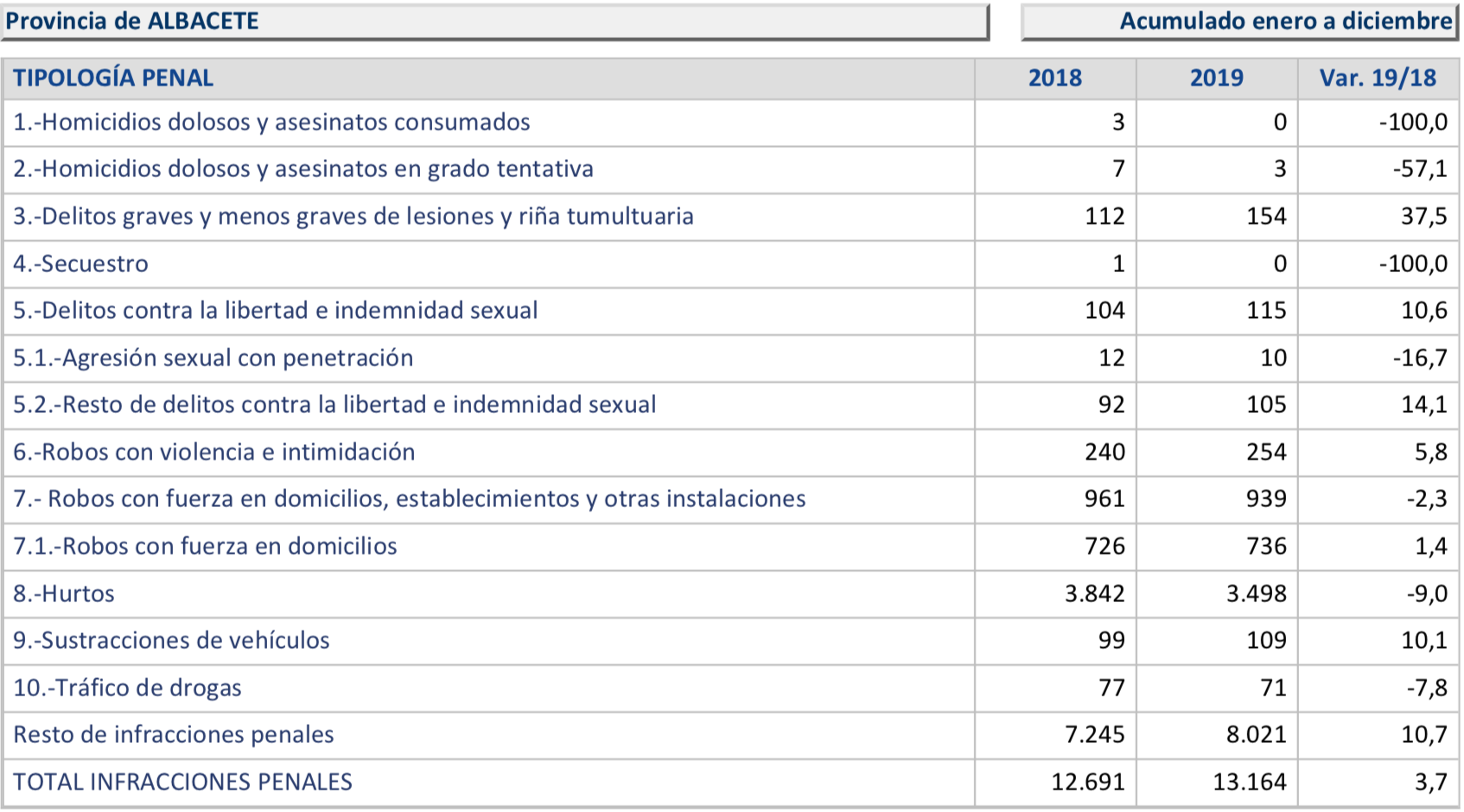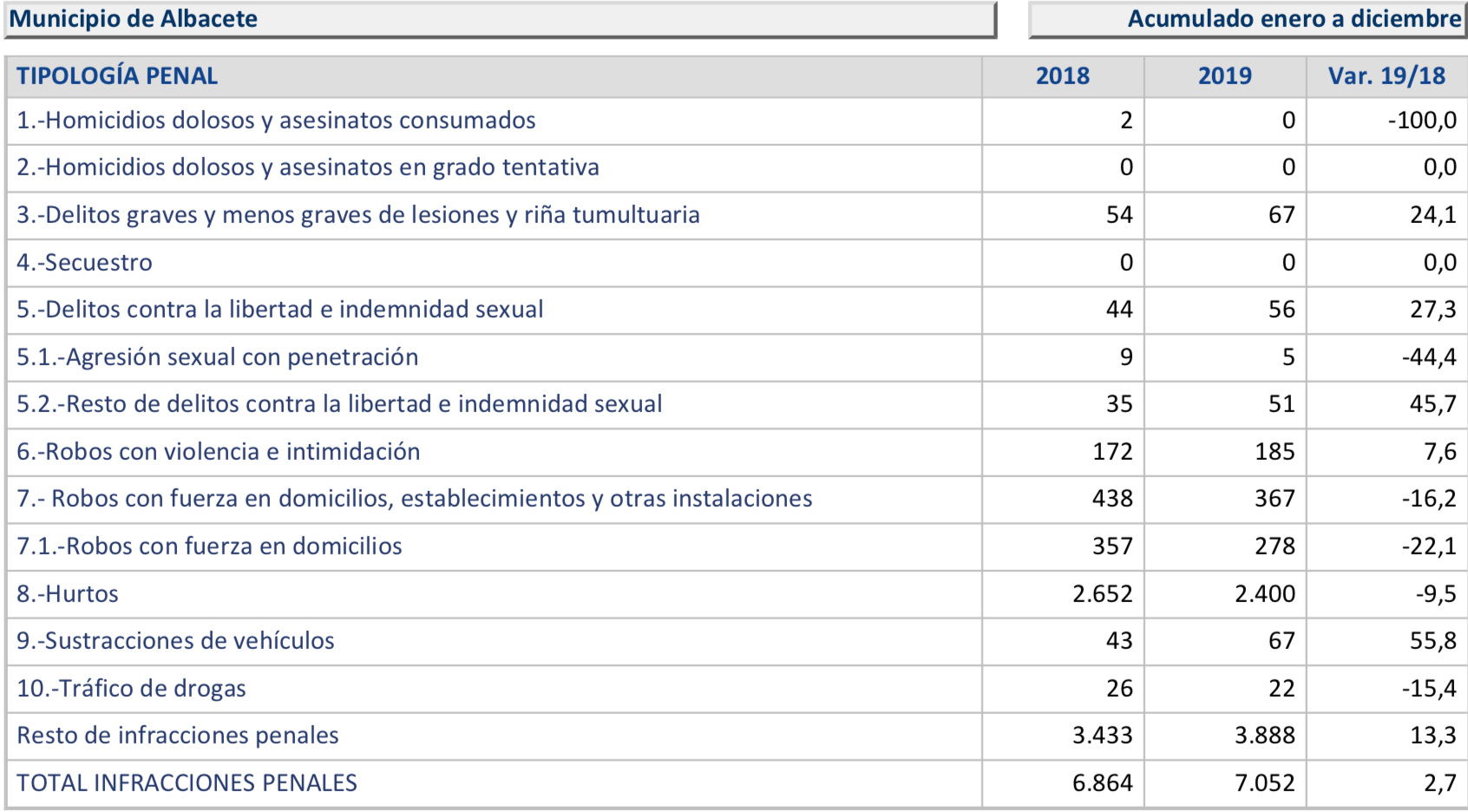 Así, en el municipio de Albacete el total de infracciones penales denunciadas ante las Fuerzas y Cuerpos de Seguridad del Estado llegó a las 7.052, un 2,7% más. Entre los delitos que marcan subidas están los de sustracción de vehículos, 67, más de uno a la semana; y resto de delitos contra la libertad e indemnidad sexual, 51, casi uno a la semana. Por el contrario, desciende en un 100% los delitos de homicidio dolosos y asesinatos consumados ya que de los dos casos que se registraron en 2018 se ha pasado a ninguno durante el año pasado.
