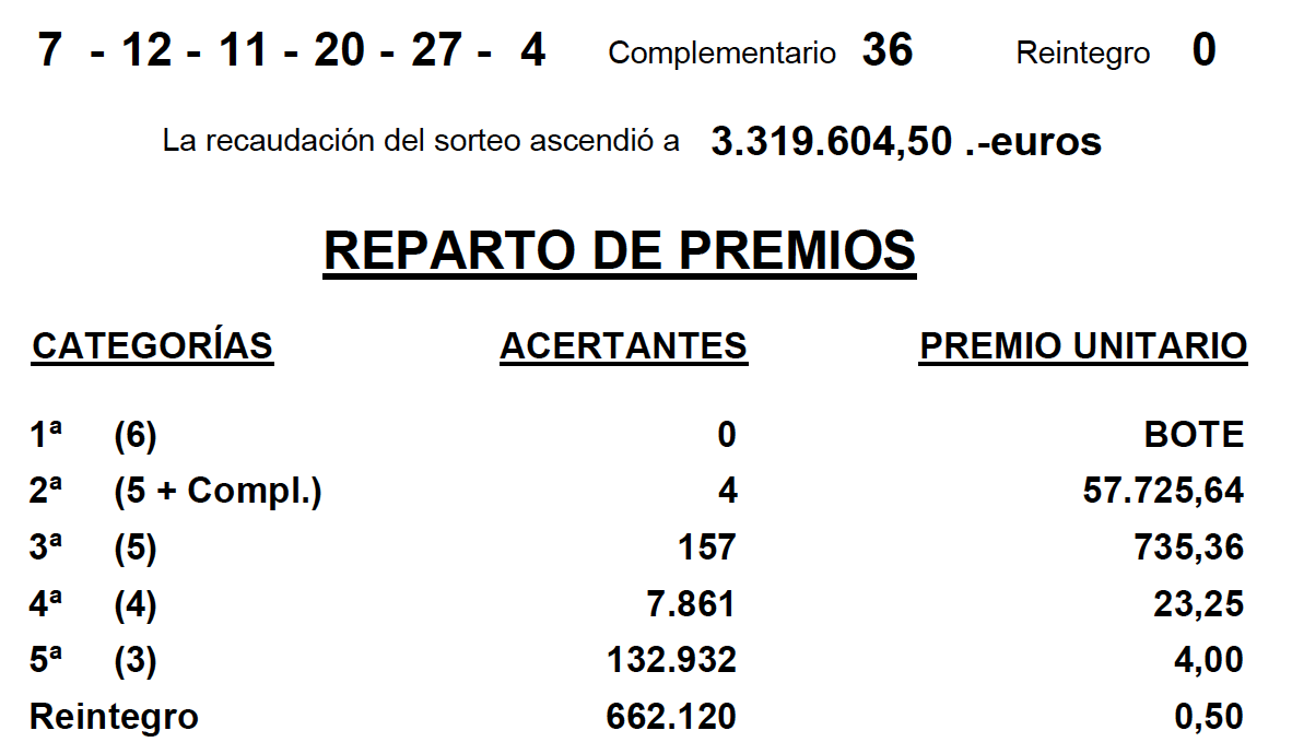 De Segunda Categoría (5 aciertos + Complementario) existen CUATRO boletos acertantes que han sido validados en la Administración de Loterías Nº 87 de VALENCIA, en el Despacho receptor Nº 45.735 de LEÓN, y dos boletos través del canal oficial de internet Loterías y Apuestas del Estado: www.loteriasyapuestas.es.
