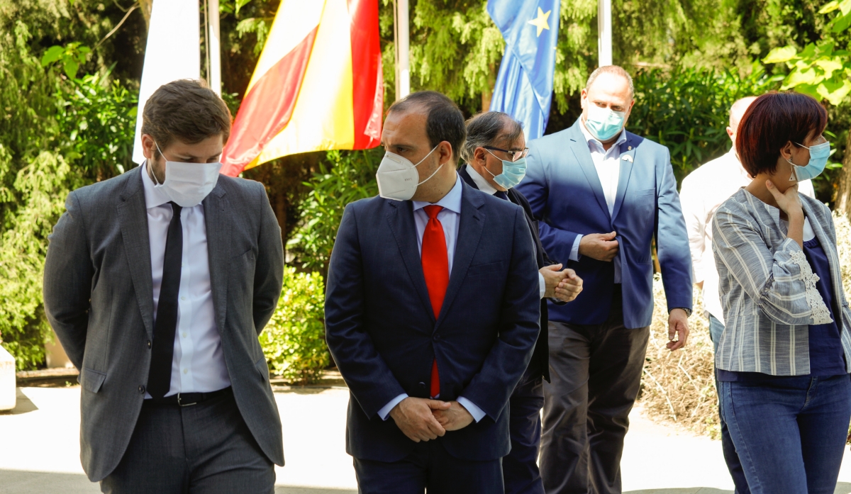 El presidente de las Cortes regionales, Pablo Bellido; el consejero de Fomento, Nacho Hernando -que comparece esta mañana en Comisión, interrumpida minutos antes de las 12:00-, diputados y diputadas de los tres grupos parlamentarios de PSOE, PP y Cs y personal de la casa han detenido su actividad y se han concentrado con medidas de seguridad como mascarillas, a las puertas del edificio de grupos de la sede del parlamento en Toledo.