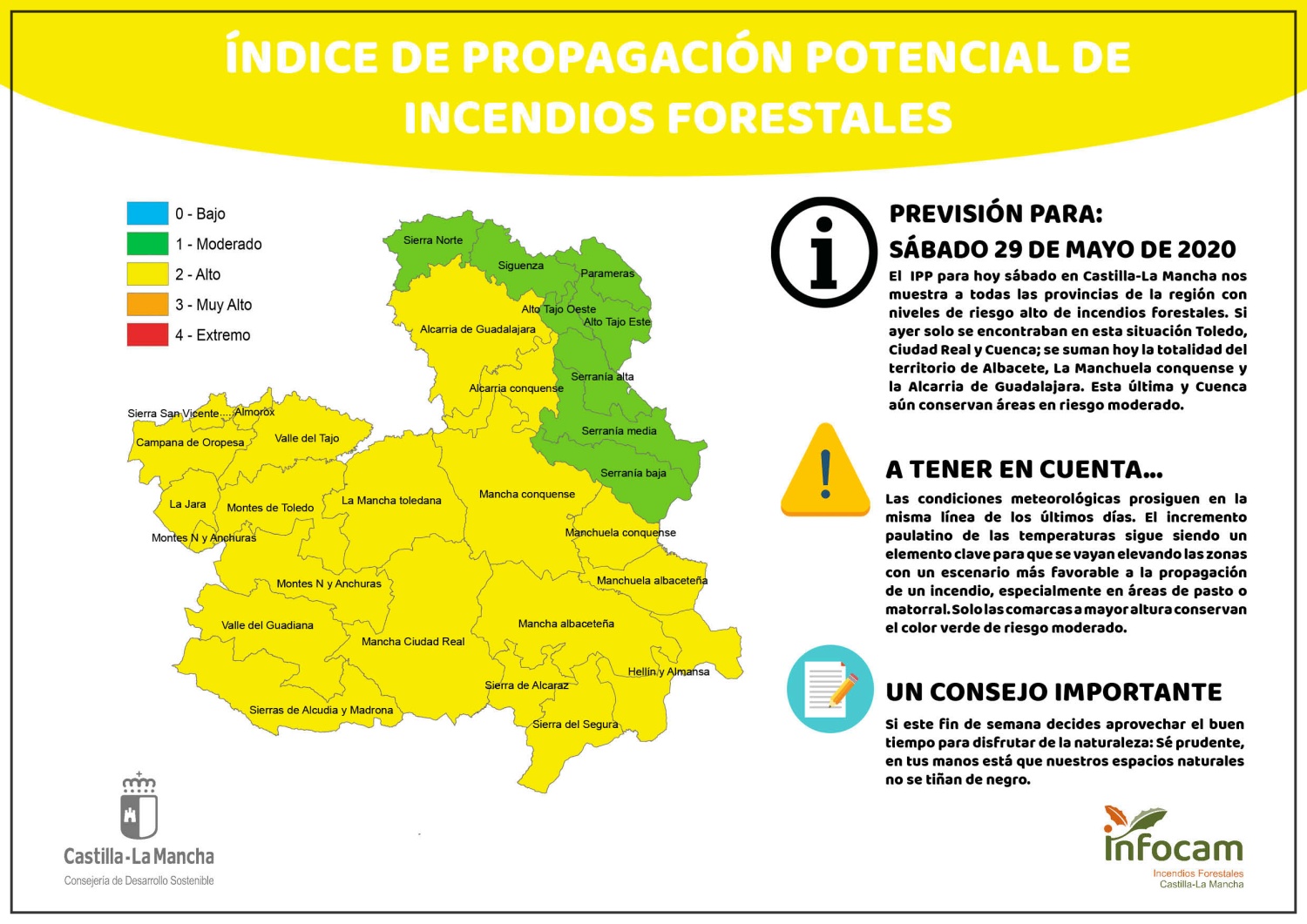 Según ha informado la Consejería de Desarrollo Sostenible, este viernes solo se encontraban en esta situación Toledo, Ciudad Real y Cuenca, a la que se suman mañana la totalidad del territorio de Albacete, La Manchuela conquense y la Alcarria de Guadalajara, aunque esta última y Cuenca aún conservan áreas en riesgo moderado.