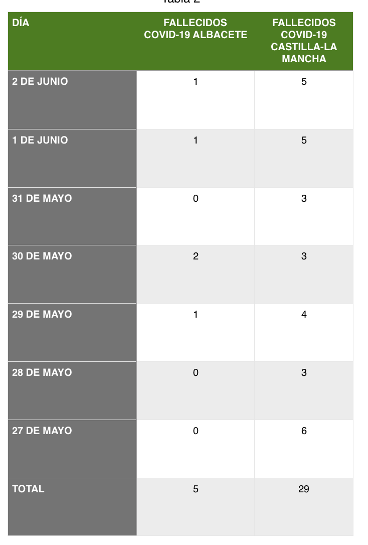 Así es el caso de Castilla-La Mancha, que ha informado este martes de otros 5 fallecidos por COVID-19 en las últimas 24 horas, uno de ellos en Albacete, que sumados a los 5 notificados ayer lunes hacen un total de 10 fallecidos en Castilla-La Mancha por COVID-19, dos de ellos en Albacete, que para el Ministerio de Sanidad, de momento, no existen en sus estadísticas.