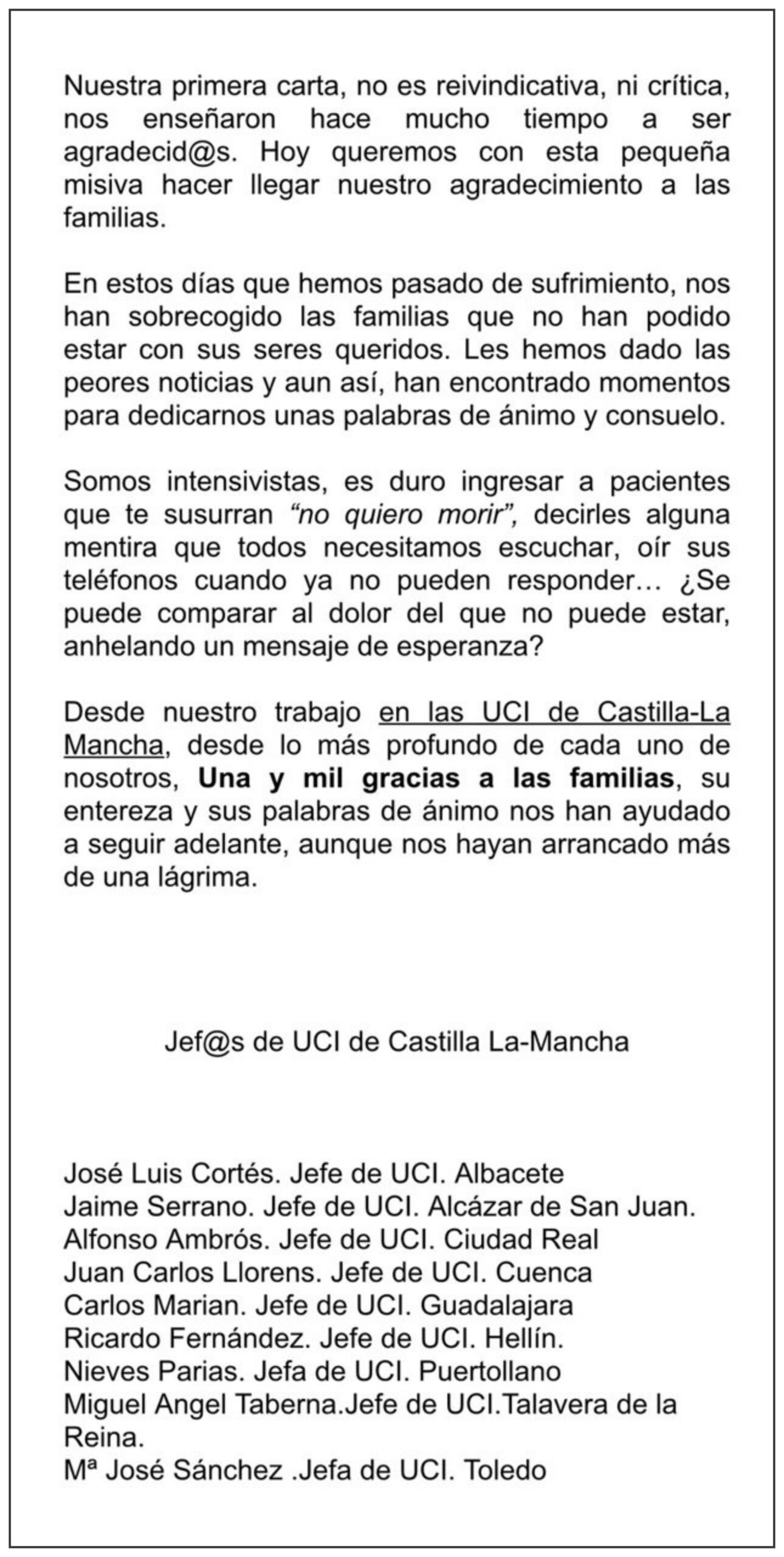 Por ello, desde su trabajo en las UCI de Castilla-La Mancha y desde «lo más profundo» de cada uno de ellos, han querido dar «una y mil gracias a las familias», por «su entereza y sus palabras de ánimo», que les han ayudado a seguir adelante, aunque también «hayan arrancado más de una lágrima».