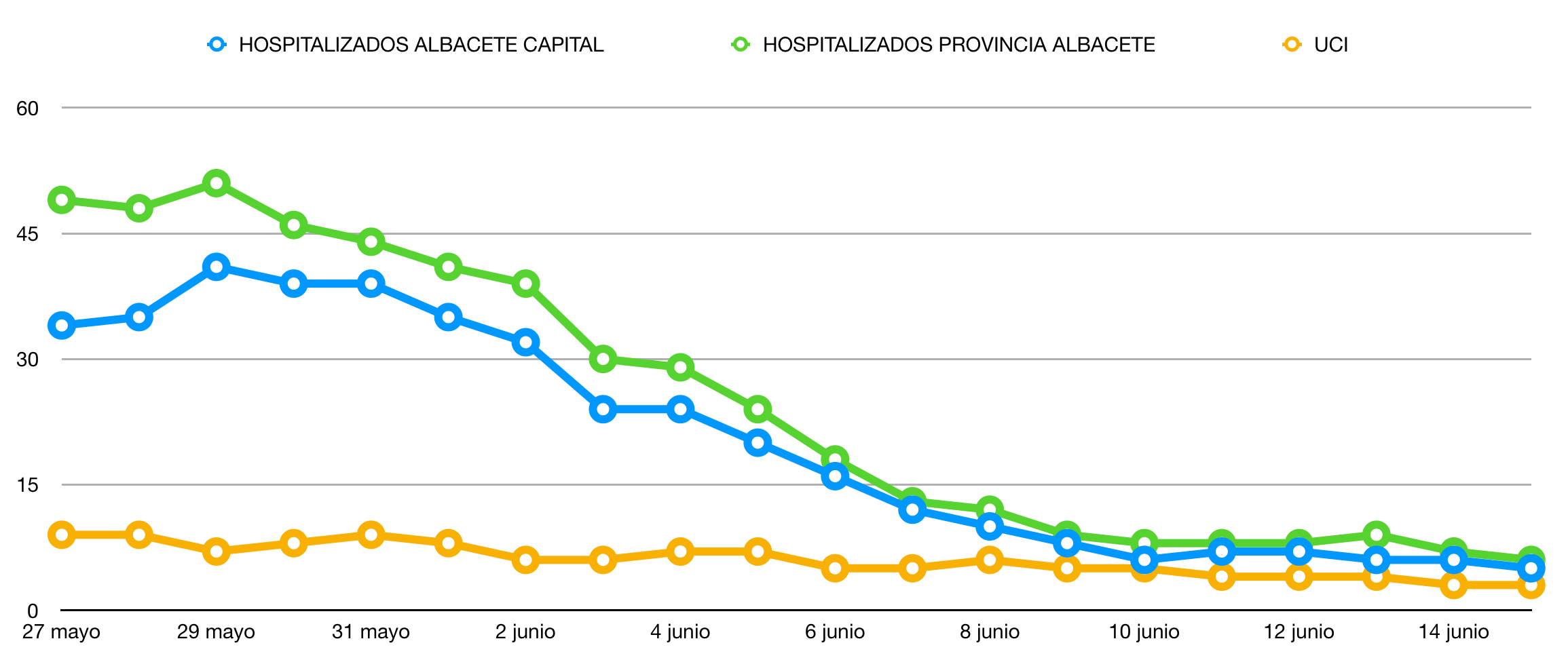 El número de hospitalizados en cama convencional es 55. Por provincias, Ciudad Real tiene 21 de estos pacientes, Toledo 16, Guadalajara 7, Albacete 6 y Cuenca 5.