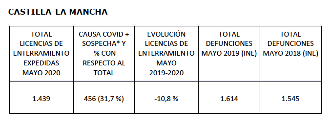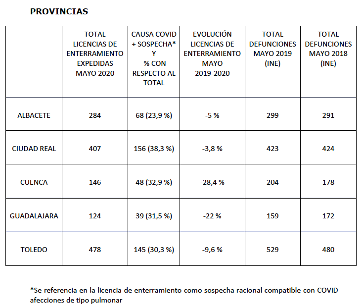 Este no es solo aplicable a la provincia de Albacete, ya que el TSJCLM señala en su informe que desde el inicio de la alerta sanitaria en Castilla-La Mancha habrían fallecido con COVID-19 o sospecha un total de 5.125 personas, 1.953 en marzo, 2.716 en abril y 456 en mayo. Para la Consejería de Sanidad del Gobierno de Castilla-La Mancha la cifra se situaba hasta el 31 de mayo en 2.977, lo que supone 2.148 muertos menos que licencias de enterramiento expedidas.