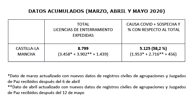 En cuanto al acumulado de datos de los meses de marzo, abril y mayo de 2020, en la provincia de Albacete se expidieron 1.909 licencias de enterramiento, de las que 1.016 fueron para difuntos con COVID-19 o sospechosos de haber muerto por el virus (341 en marzo, 607 en abril y 68 en mayo).