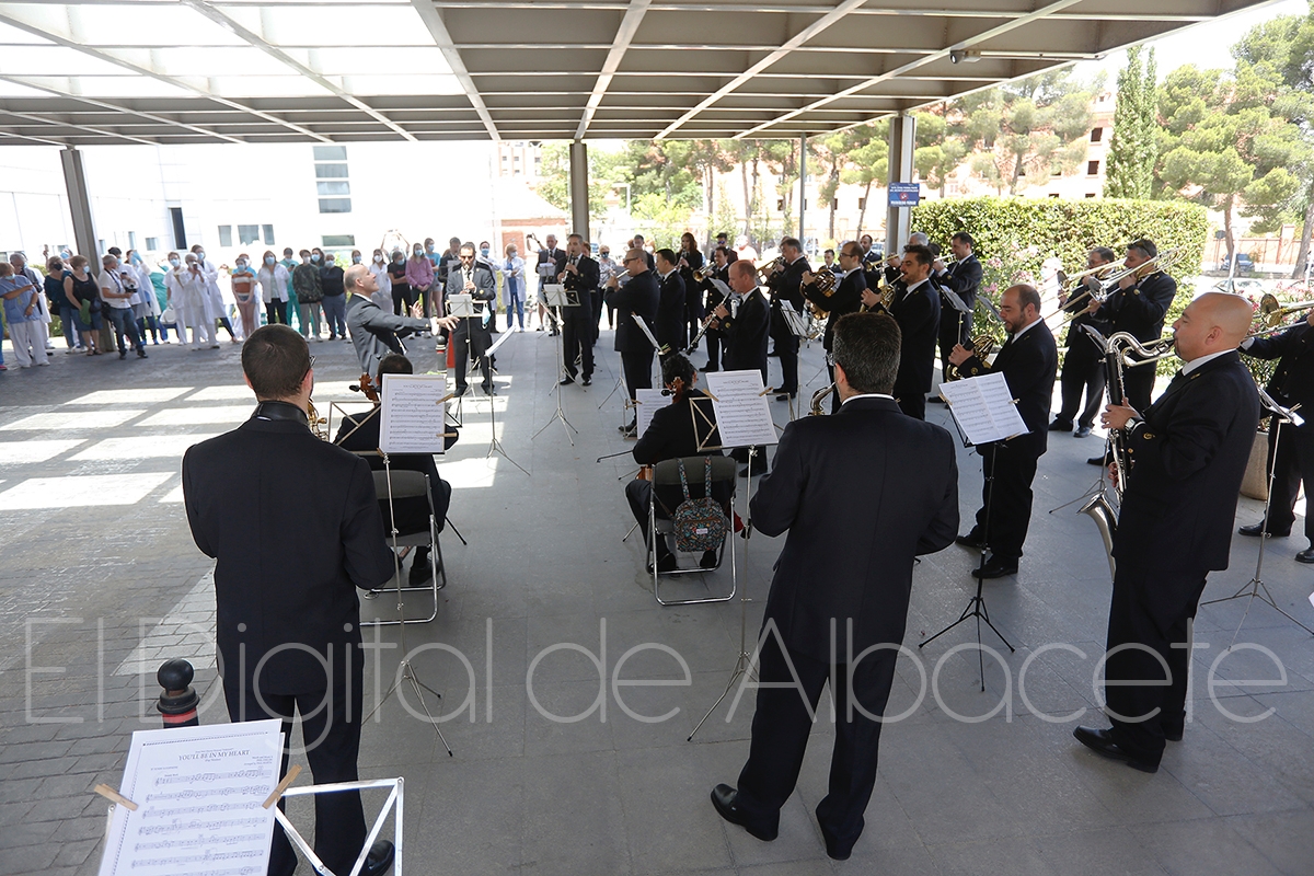 Los miembros de la Banda Sinfónica rendían así su especial homenaje, en nombre del Ayuntamiento y de toda la sociedad albaceteña, a quienes han sido los héroes de esta pandemia: los sanitarios. Un emotivo reconocimiento en forma de música que emocionaba al personal sanitario, pero también a los pacientes de ambos hospitales.