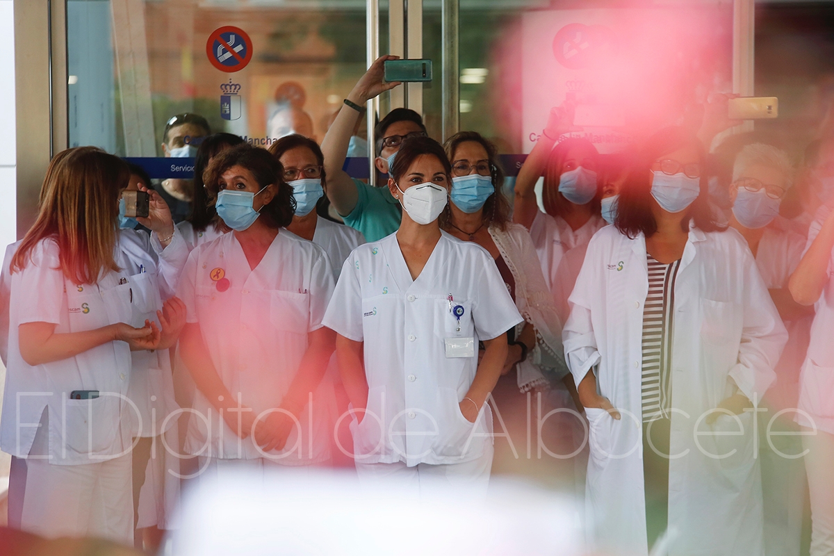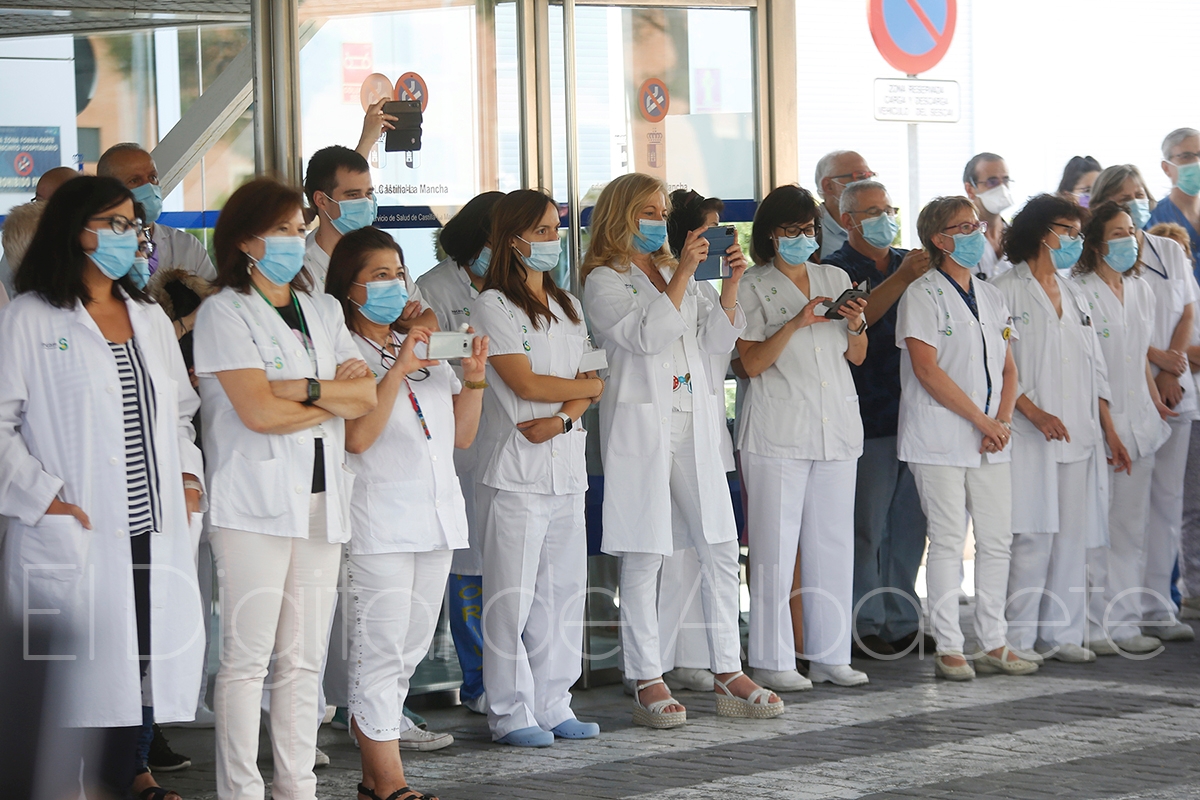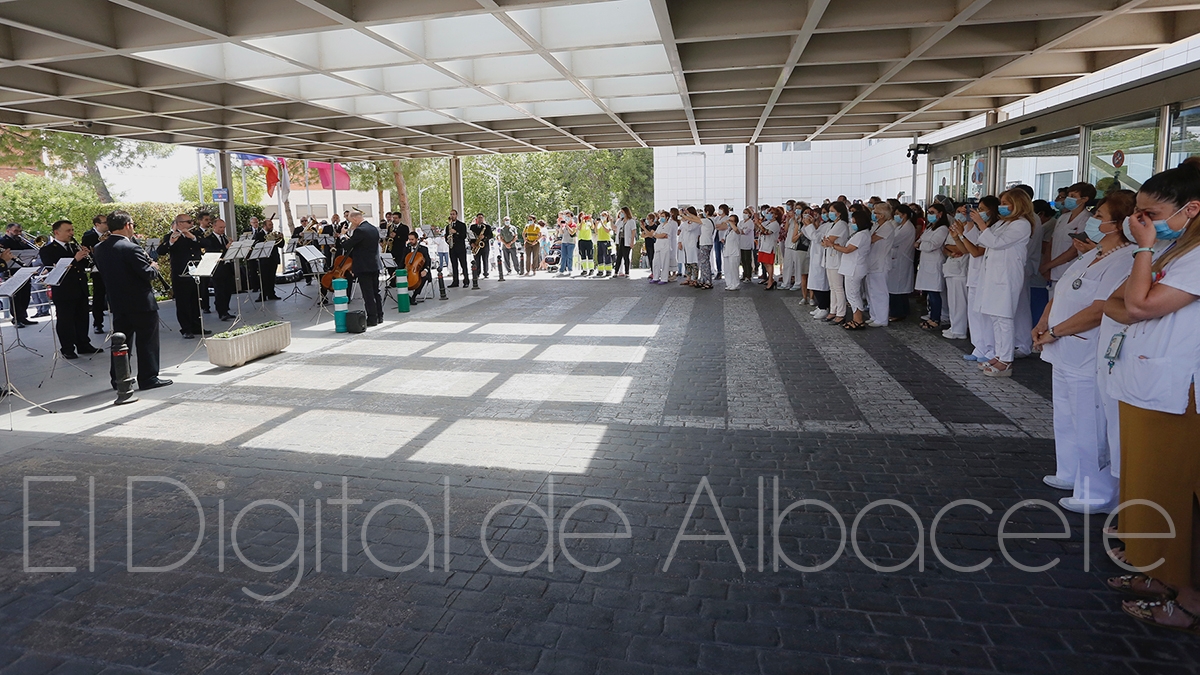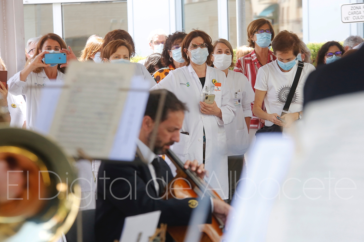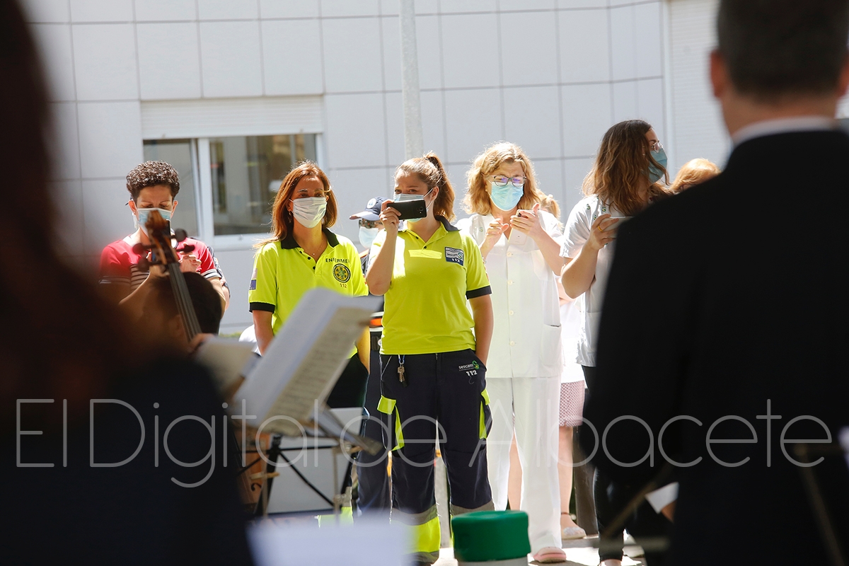 Los miembros de la Banda Sinfónica rendían así su especial homenaje, en nombre del Ayuntamiento y de toda la sociedad albaceteña, a quienes han sido los héroes de esta pandemia: los sanitarios. Un emotivo reconocimiento en forma de música que emocionaba al personal sanitario, pero también a los pacientes de ambos hospitales.