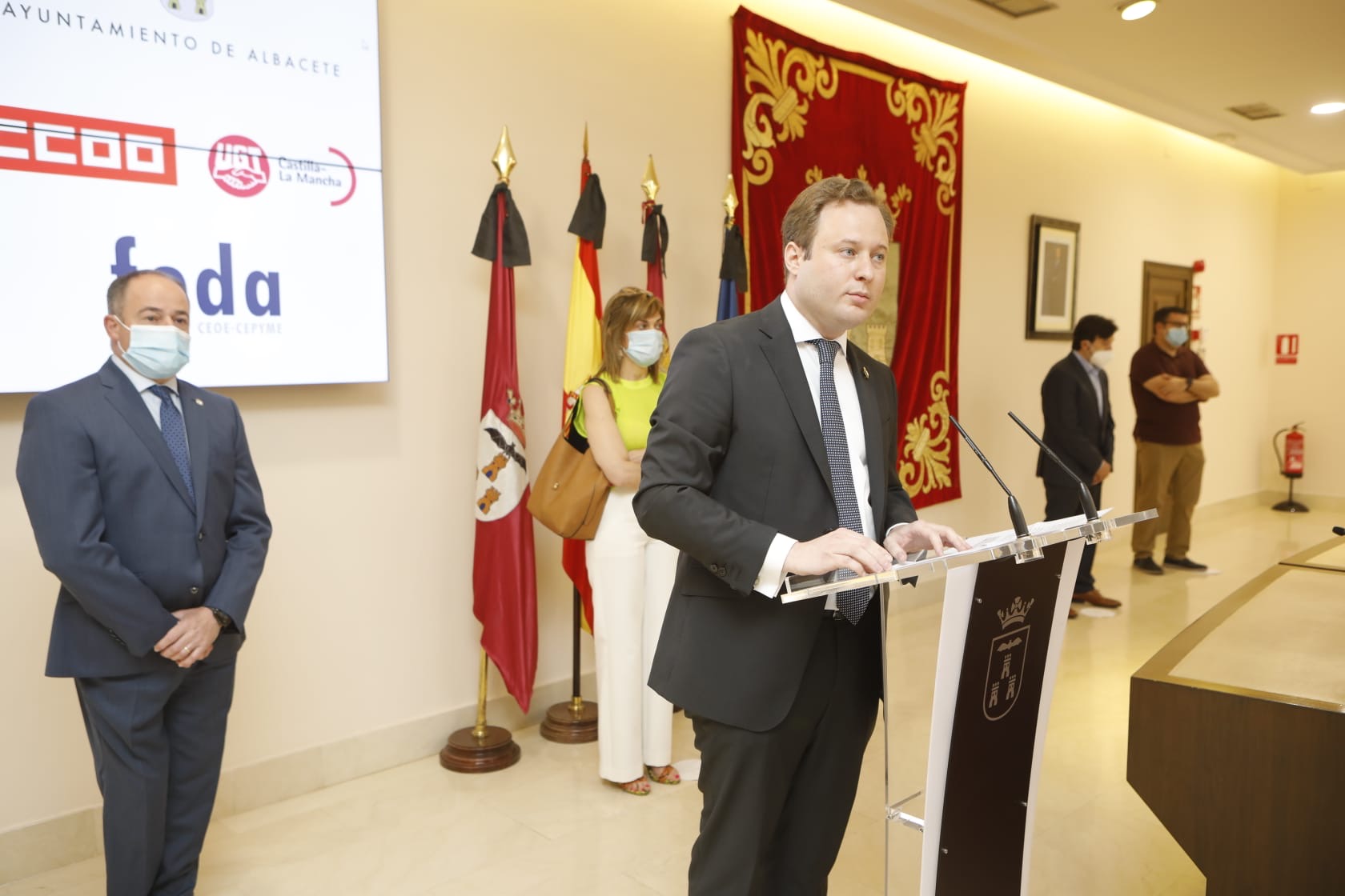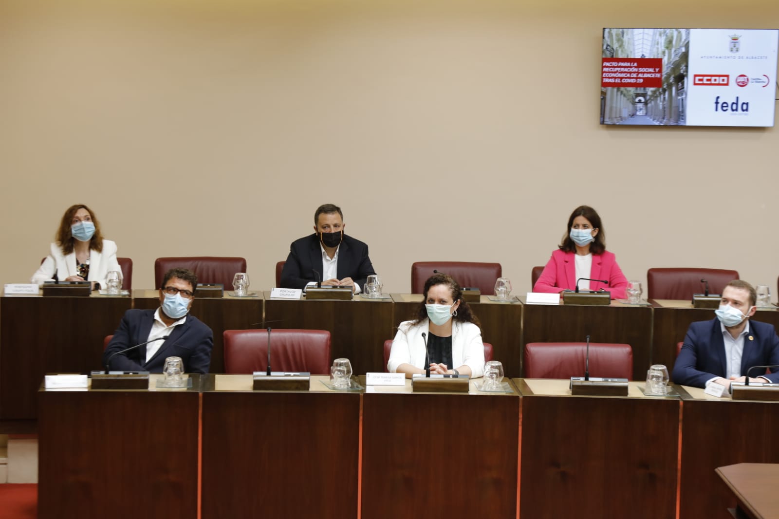 El salón de plenos del Ayuntamiento de Albacete ha acogido hoy la firma del “Pacto por la Recuperación Social y Económica de Albacete”, un instrumento dotado con 19,2 millones de euros, que ha sido rubricado por el alcalde, Vicente Casañ; la secretaria provincial de CCOO, Carmen Juste; el secretario provincial de UGT, Javier González, y el presidente de la Confederación de Empresarios de Albacete, Artemio Pérez, siendo testigo de esta rúbrica el vicealcalde, Emilio Sáez.