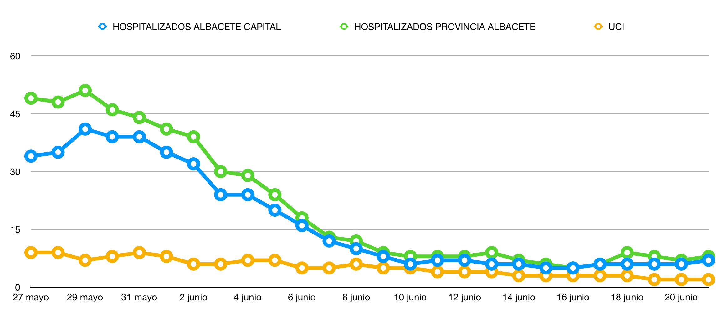 Por hospitales, el Complejo Hospitalario de Albacete tiene 7 de estos pacientes, el Hospital de Almansa ninguno, el Hospital de Tomelloso 1, el Hospital de Manzanares 1, el Hospital de Guadalajara 8, el Hospital de Ciudad Real 8, el Hospital Nacional de Parapléjicos ninguno, el Hospital Mancha Centro 1, el Hospital de Villarrobledo ninguno, el Hospital de Talavera de la Reina 4, el Hospital de Cuenca 5, el Hospital de Hellín 1, el Hospital de Puertollano ninguno, el Hospital de Valdepeñas 3 y el Hospital de Toledo 9.
