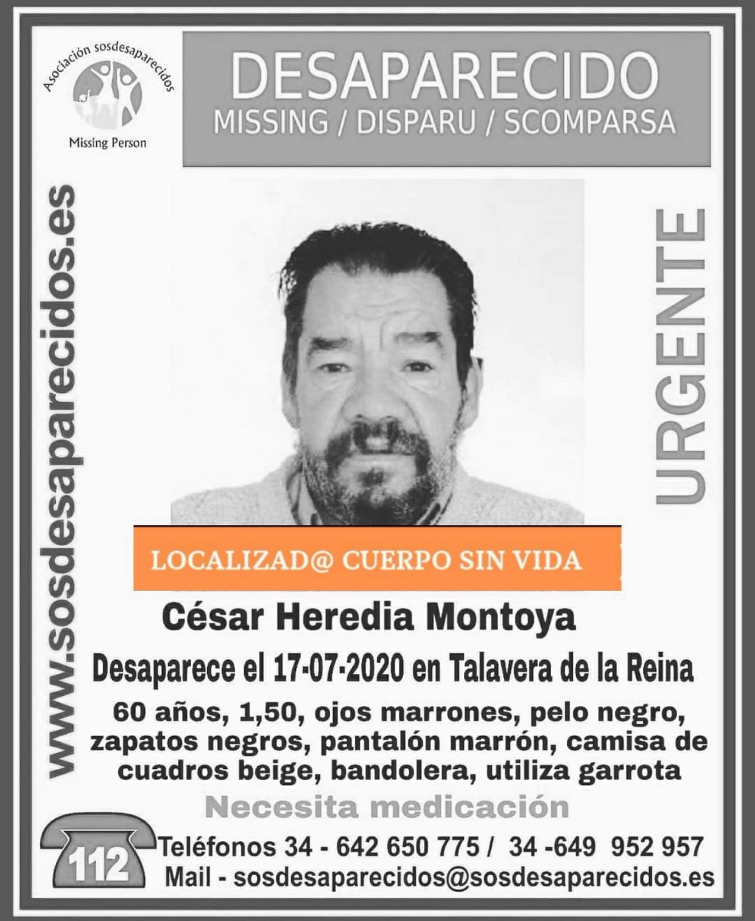 Según han indicado desde la Asociación SOS Desaparecidos, el cuerpo de César Heredia Montoya ha sido hallado sin vida.
