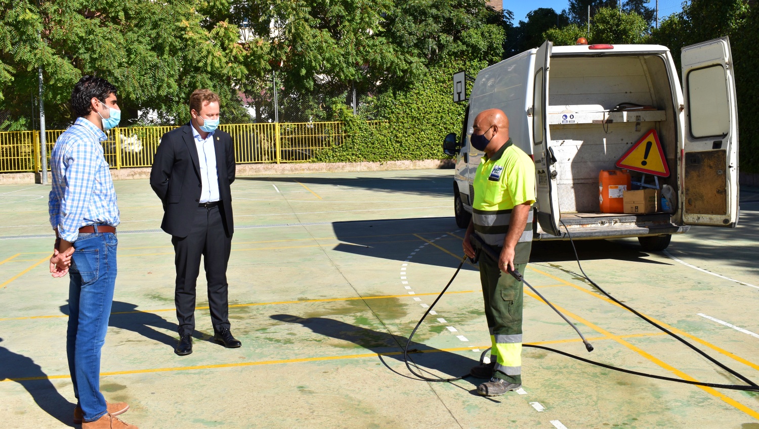 Ya en marzo, cuando se decretó la interrupción de las clases lectivas por la pandemia, la Concejalía de Educación dio instrucciones para que se hiciera una desinfección intensiva de todos los centros educativos que quedan dentro de su competencia. Este trabajo se ha vuelto a hacer ahora, desde el 26 de agosto, para preparar los colegios de cara al inicio del curso escolar. Entre otras tareas se han realizado desinfecciones de los patios, utilizando un equipo hidrolimpiador, además de la limpieza a fondo y desinfección del resto de dependencias.